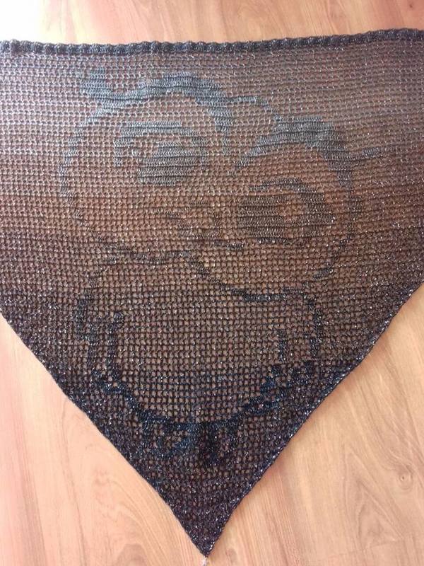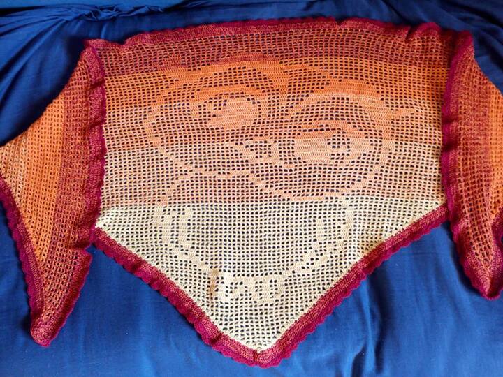 Das Tuch wurde mit ca. 1000 Metern 3- fach gefachtes Farbverlaufsgarn mit einer Nadelstärke 3 gehäkelt. Das Tuch ist ca. 225 cm lang und ca. 90 cm breit.