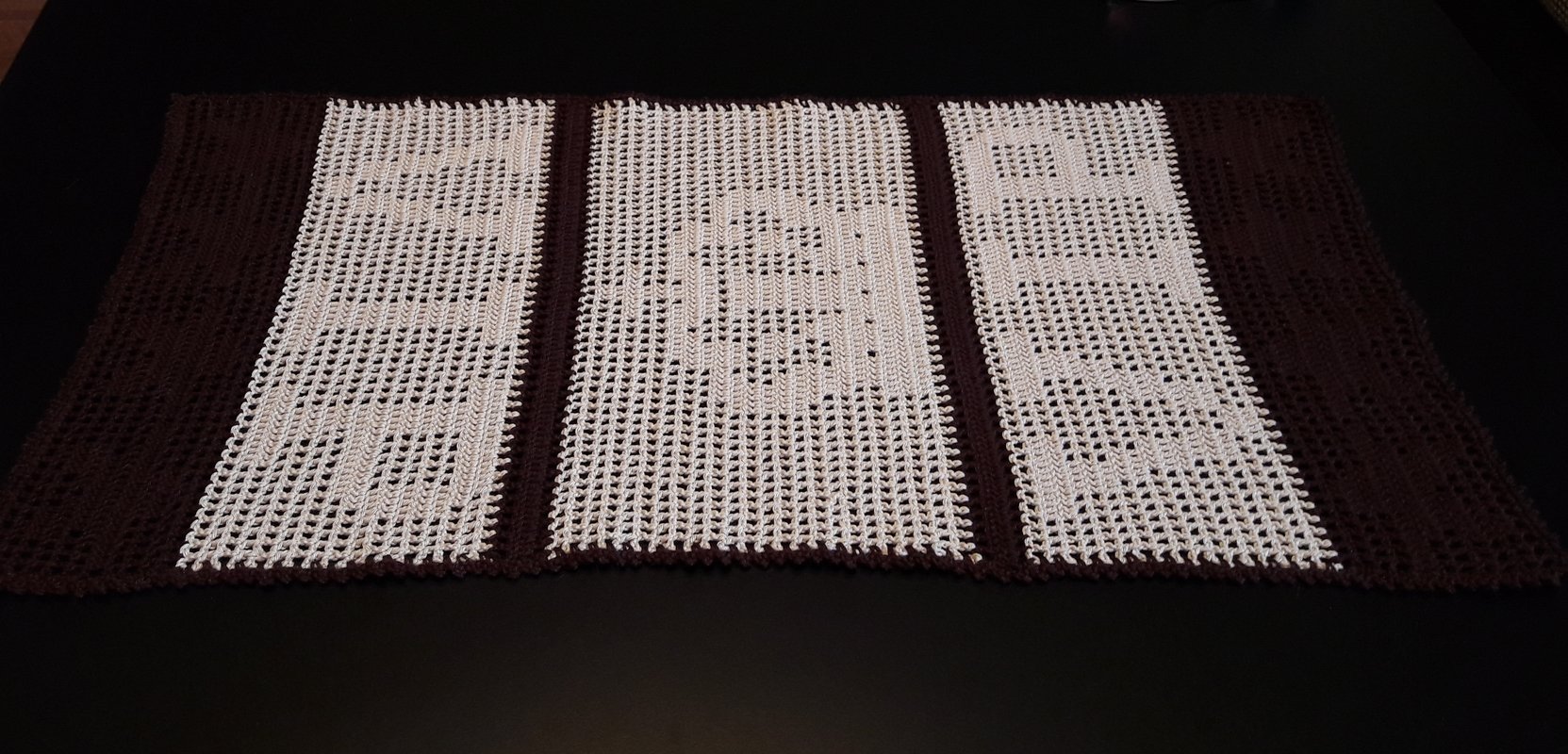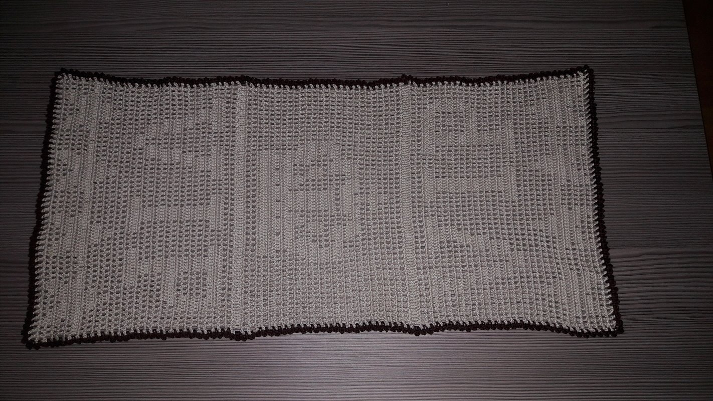 Mein Tischläufer hat eine Größe von 74x35. Er kann jedoch beliebig vergrößert werden, indem man entweder mehr Kästchenreihen häkelt oder die Zwischenstreifen größer macht.