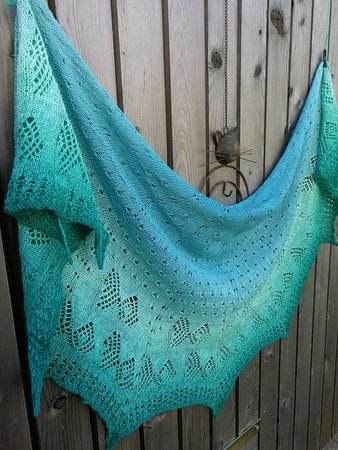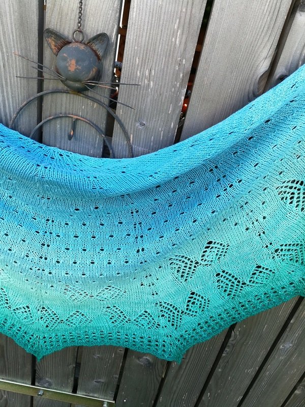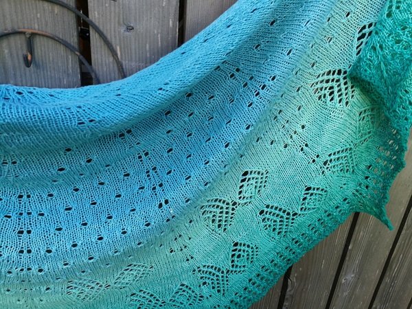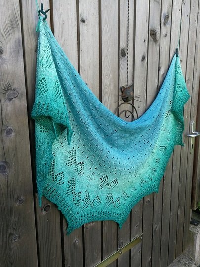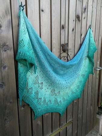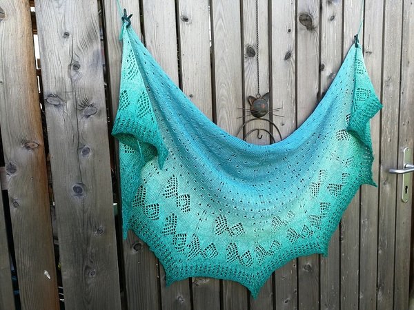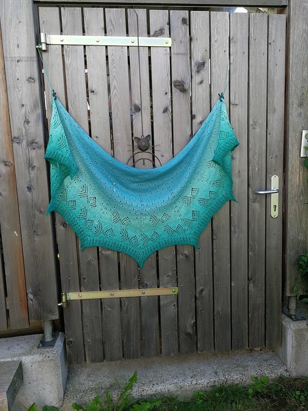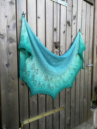 Das halbrunde Dreieckstuch „Fische Frizzante“ besticht jedoch nicht nur durch seinen Farbverlauf allein, sondern auch durch das Strickmuster. Das Tuch wird aus einem Bobbel gestrickt und von oben begonnen. Die schwierigsten Maschen sind die rechts verkreuzt gestrickten.