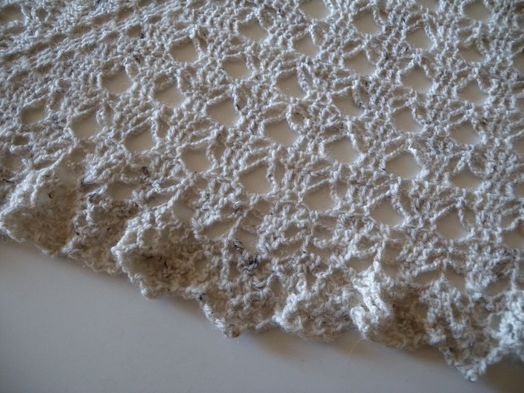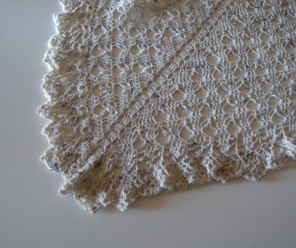 Das Tuch auf den Fotos wurde aus Lana Grossa Meilenweit Tweed gehäkelt, eine ganz normale Sockenwolle, wie man sie fast überall bekommt. Die Anleitung funktioniert aber auch in anderen Garnstärken, es muss nicht unbedingt Sockenwolle sein.