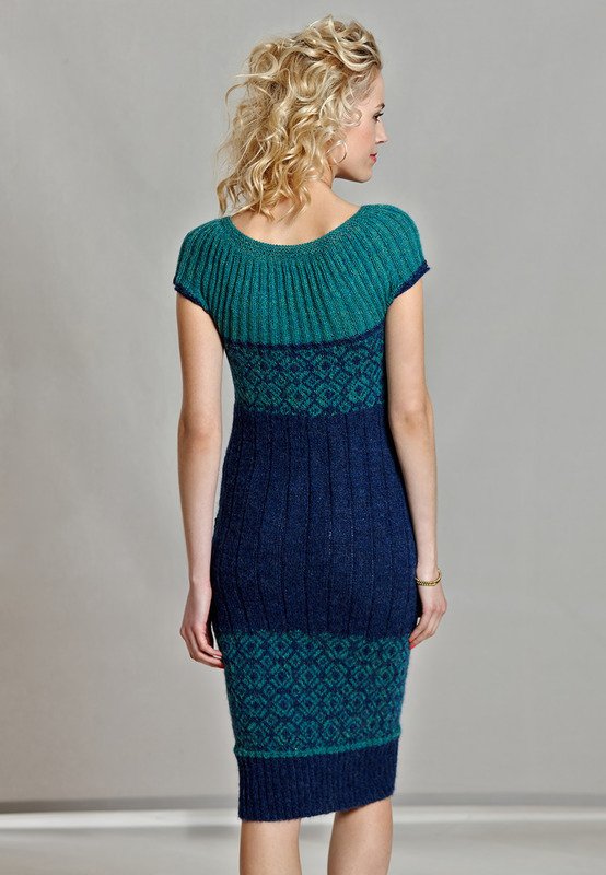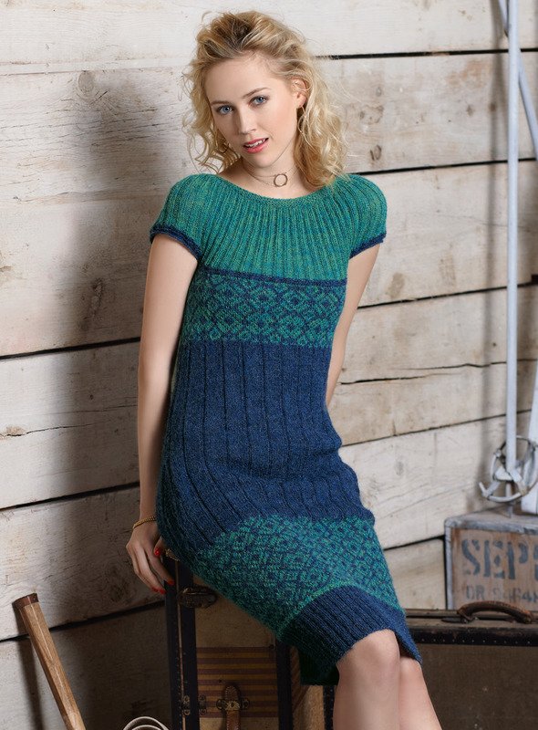 Monika Design Yarns "Anta" (100% Alpaka superfein, LL ca 183 m/50 g): ca 250 (250-300) g Blau Fb 866 und ca 150 (150-200) g Grün meliert Fb 740, addi-Rundstricknd 4,5 mm, 80 cm lang; addi-Nadelspiel 4 mm.