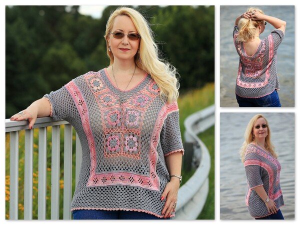 Einzelne Häkelquadrate (Grannys) werden miteinander verbunden und bilden den Halsausschnitt. Anschließend wird außen herum gehäkelt.