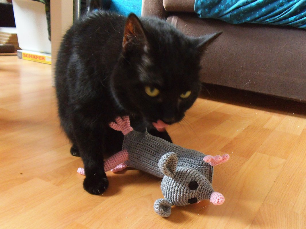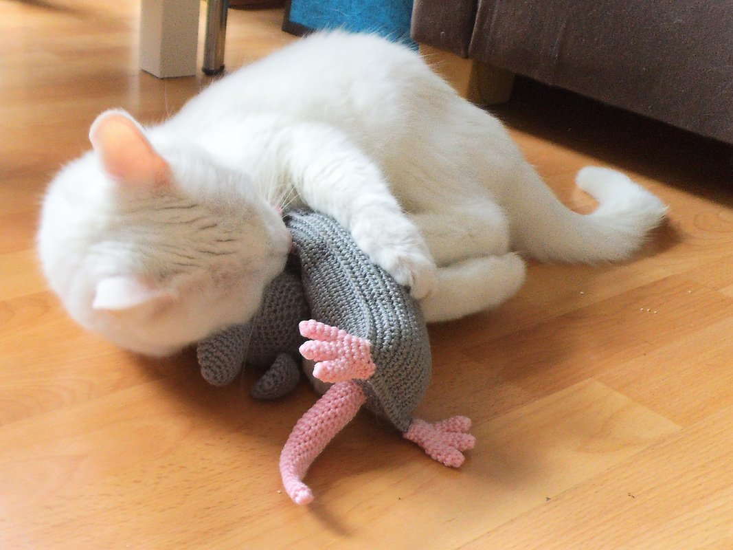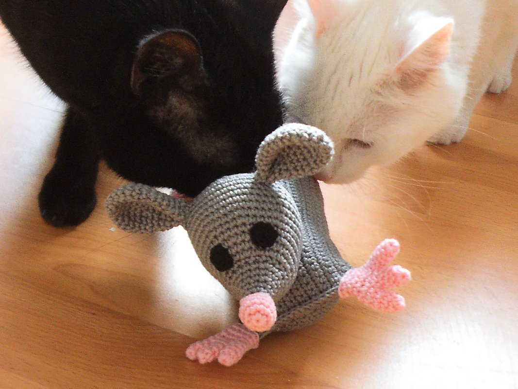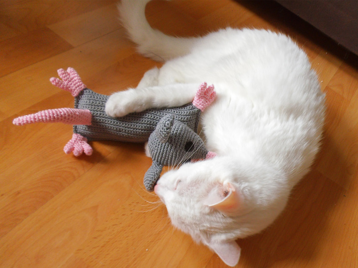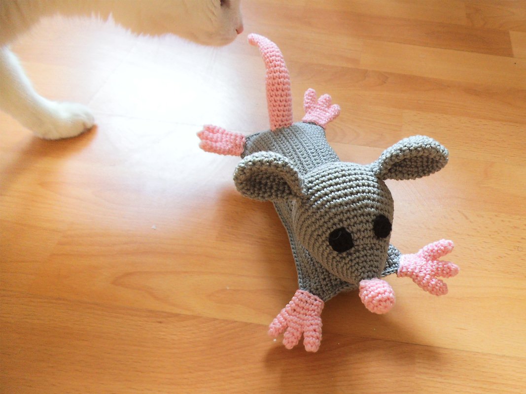 Diese Amigurumi-Ratte ist genau das Richtige für verspielte Katzen, die ihrem Jagdtrieb nachgehen wollen. Der Körper ist gefüllt mit einer Mischung aus Watte und Catnip (Katzenminze) und lädt regelrecht zum Spielen ein.