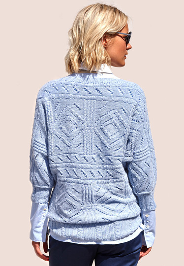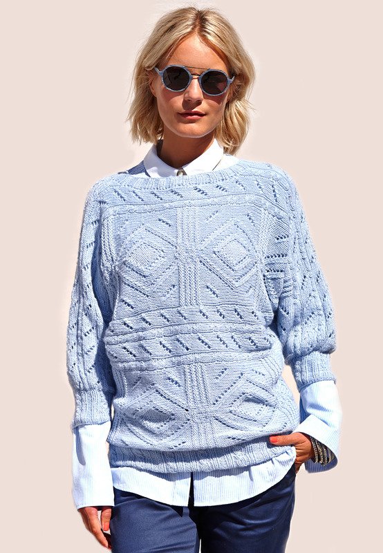 So ein lässiger Pullover passt ins Büro, aber auch in unseren Urlaubskoffer. Ein lässiges Teil mit weiten, quergestrickten Fledermausärmeln und einem hübschen Ajour- und Zopfmustermix.