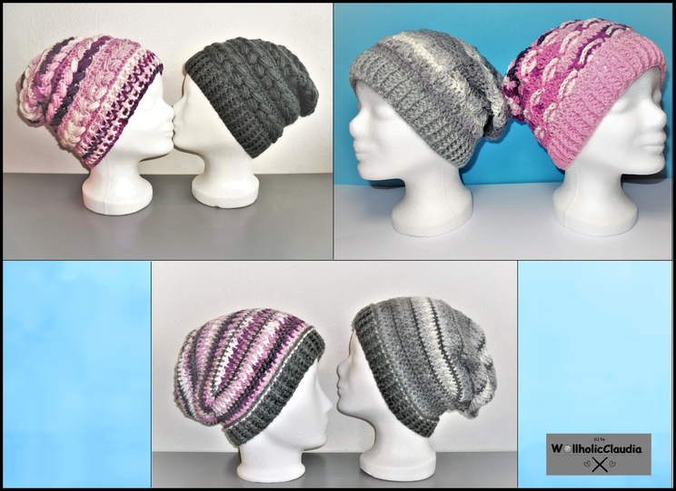 Eine Anleitung - 2 Mützen. Durch die Anordnung der verschiedenen Maschen ensteht dieses hübsche Muster, welches von beiden Seiten einfach toll aussieht. Die Anleitung beinhaltet 3 Größen: