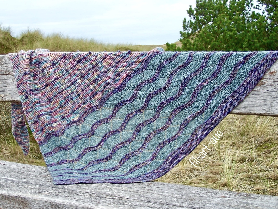 „EBBE & FLUT“ ist ein gemütliches DREIECKSTUCH zum Reinkuscheln und Träumen. Es wird seitwärts mit wechselnden Musterabschnitten gestrickt – kraus rechts gestrickte Maschen, Noppen und ein wunderschönes Lochmuster, das sanfte Wellen erzeugt, bilden das Grundgerüst dieses Tuches! Die Farben und Strukturen erinnern an weiten Sandstrand und Meereswellen und so versetzt mich dieses Tuch immer wieder in Urlaubsstimmung! Ich bin mir sicher: Auch Ihr werdet es lieben!