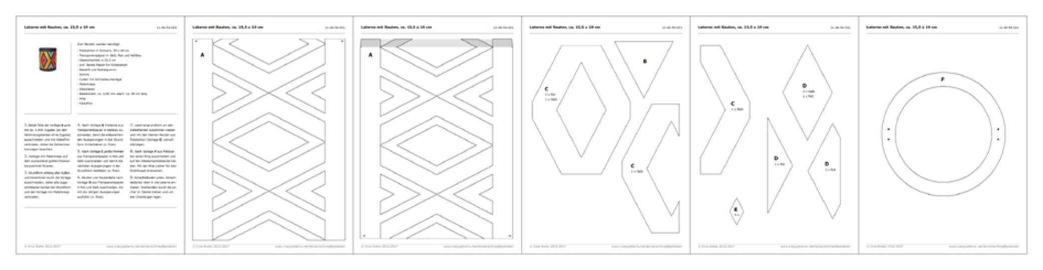 Der Download enthält eine PDF-Datei mit einer Seite Bastelanleitung sowie fünf Seiten Vorlagenzeichnungen in Originalgröße. Vorlagenteile für die Laternengrundform müssen vor dem Übertragen auf den Fotokarton mit Klebefilm verbunden werden, Zahlenmarkierungen helfen dabei.