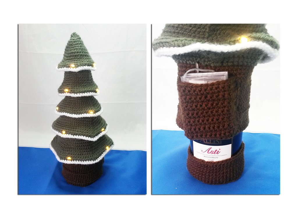 Ein beleuchteter Weihnachtsbaum und im innern die Sekt- oder Weinflasche, damit wird das Geschenk zum Highlight, aber auch als Dekoration ein Blickfang.