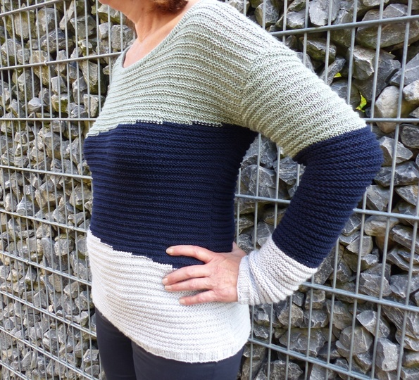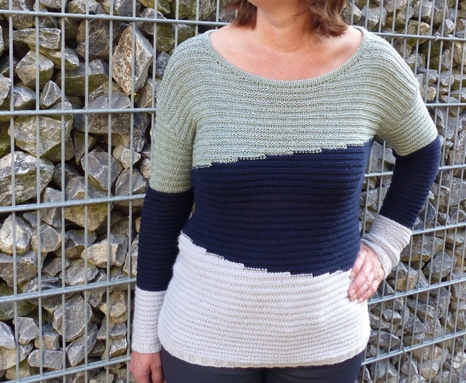 Diesen Pullover habe ich aus 3 verschiedenen Garnen und Farben gestrickt. Das Muster ist relativ einfach. Man muss nur rechte und linke Maschen stricken können.