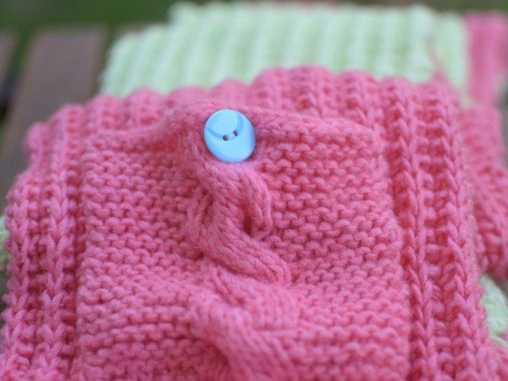 Einfache Anleitung eines gestrickten kuschligen Schals mit einer kleinen Tasche auf der Vorderseite.