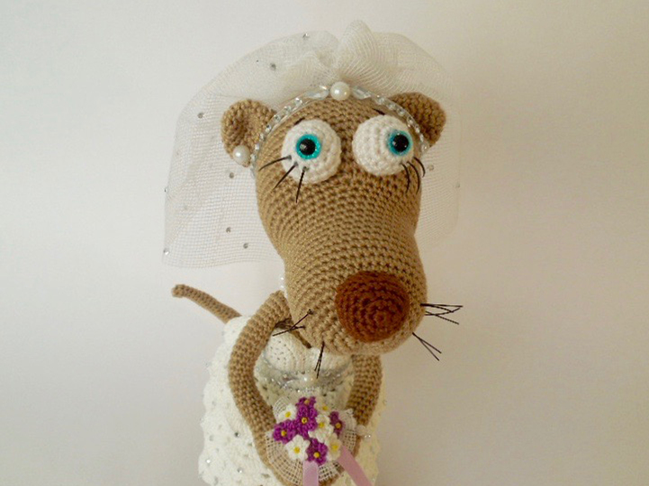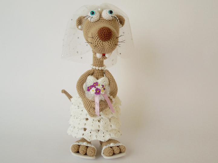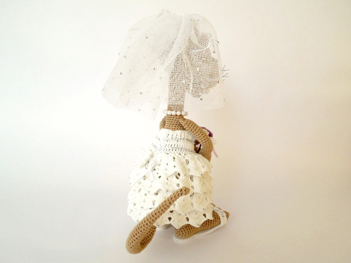 Die Anleitung beinhaltet die Figur, das Hochzeitskleid, Schleier, Glitzer-Sandalen, Diadem und Blumenstrass.