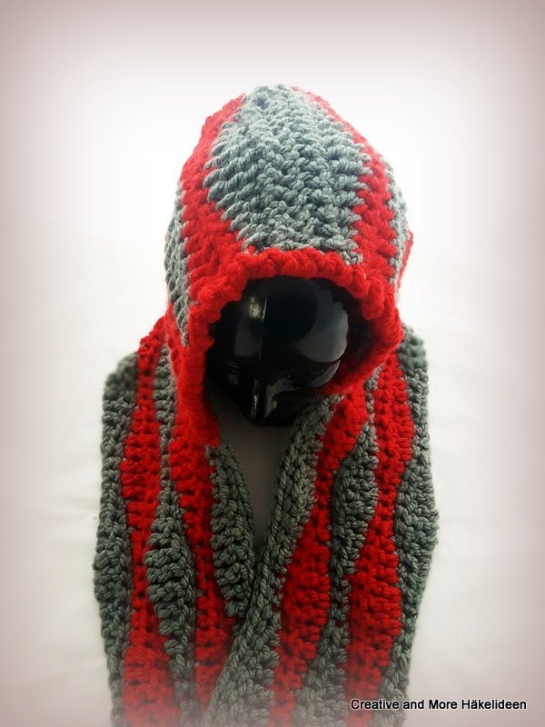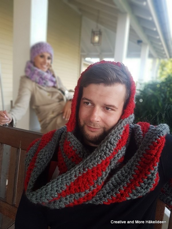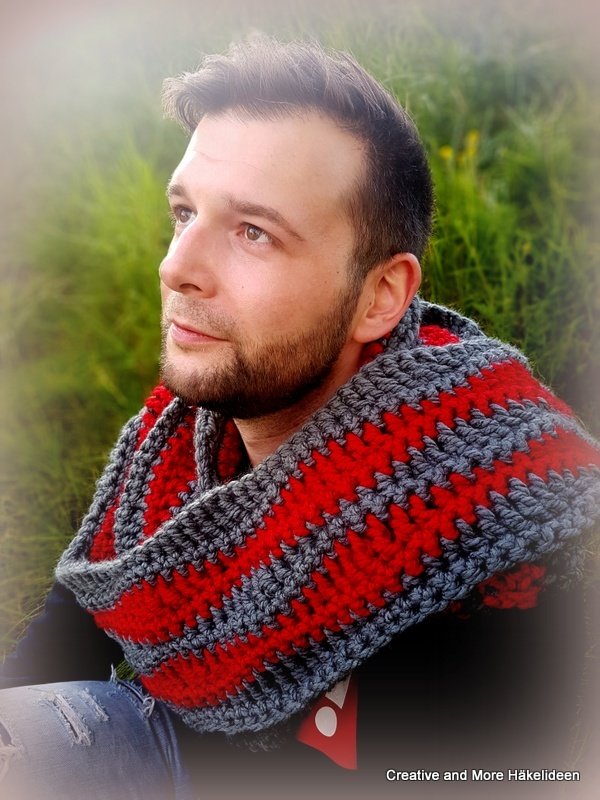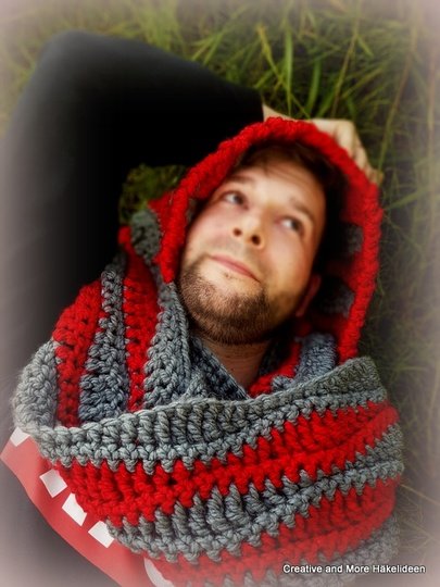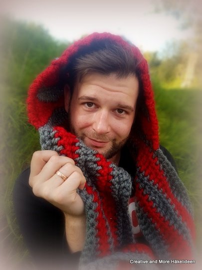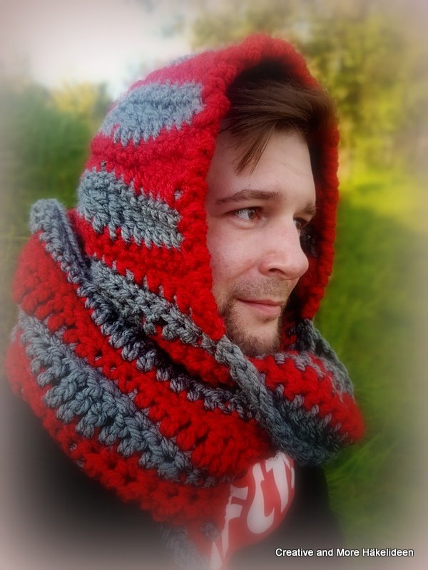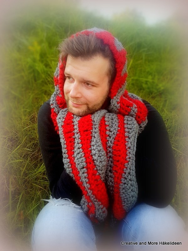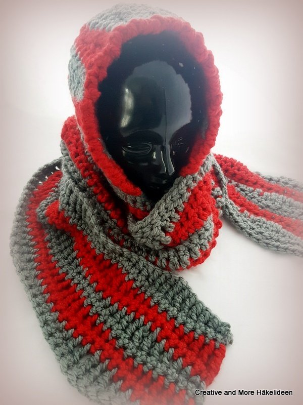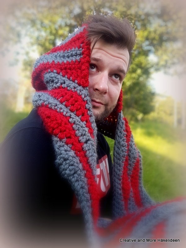 Die Anleitung enthält eine Häkelschrift, eine schriftliche Erklärung und Fotos, so daß es ganz leicht ist, diesen herbstlichen Scoodie nachzuarbeiten. Mit der angegebenen Wolle wird der Schal ca. 2,50 m lang