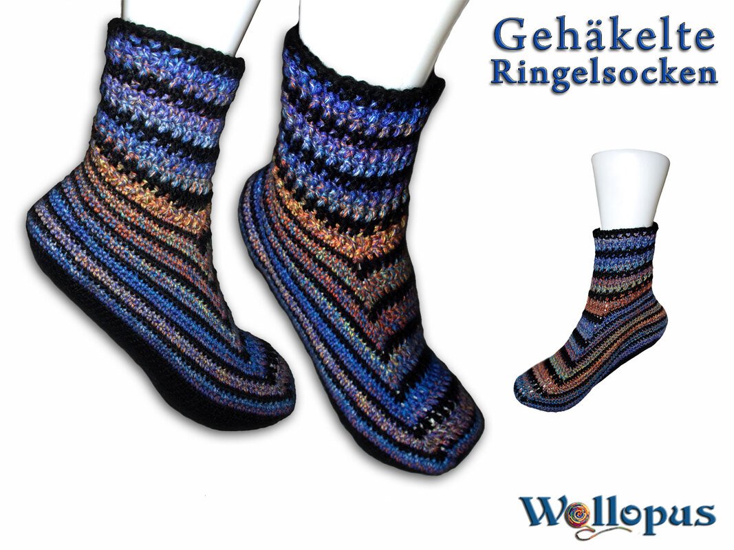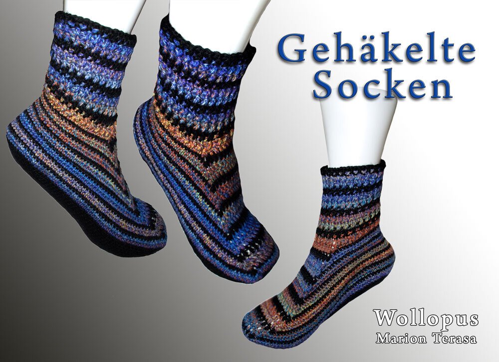 Die abgebildeten Socken sind in Größe 39 gehäkelt und wiegen zusammen 120 g.