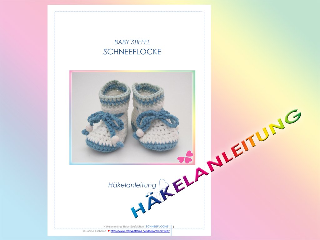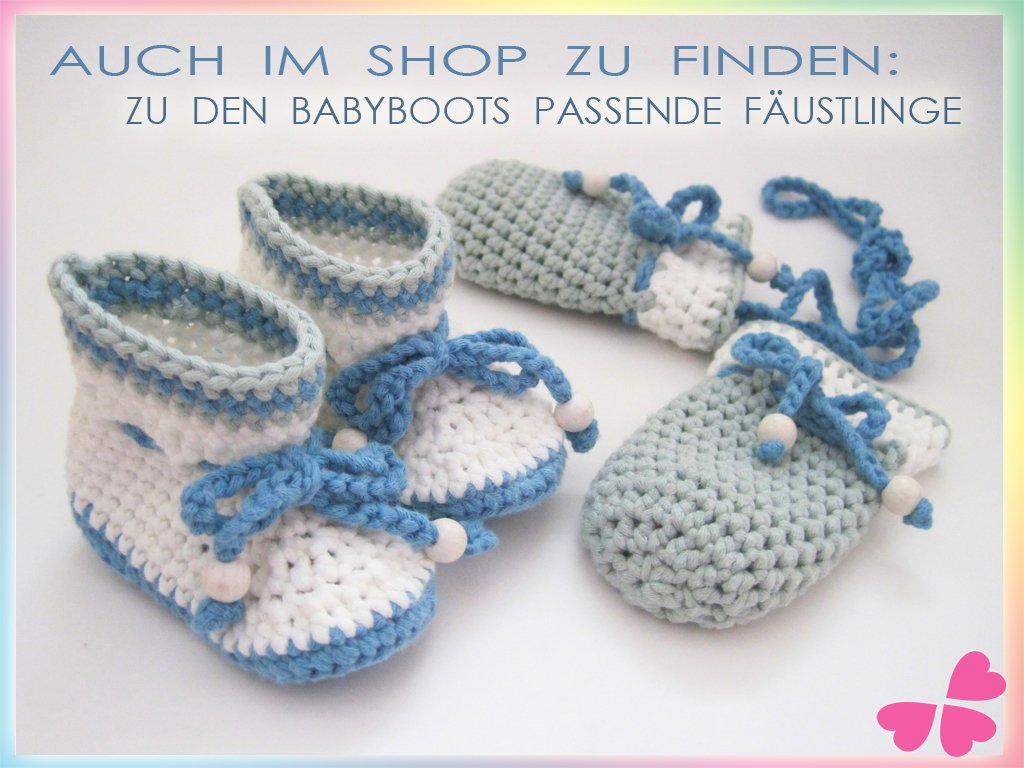 Wenn Du zu den Babystiefelchen SCHNEEFLOCKE auch noch passenden Fäustlinge häkeln willst: Die Häkelanleitung zu den Babyfäustlingen SCHNEEFLOCKE findest Du in meinem Shop!