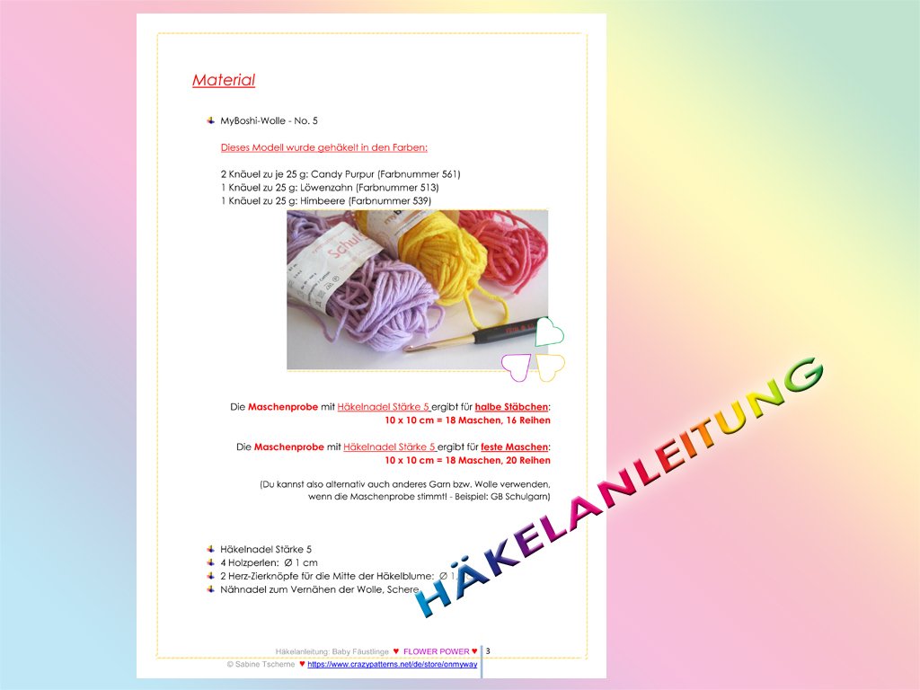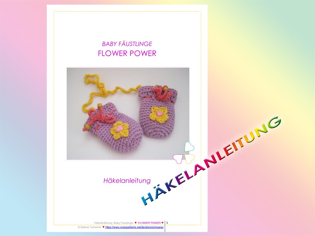 Wenn Du zu den Fäustlingen FLOWER POWER auch noch passenden Stiefelchen fürs Baby häkeln willst: Die Häkelanleitung zu den Babyboots FLOWER POWER findest Du in meinem Shop!