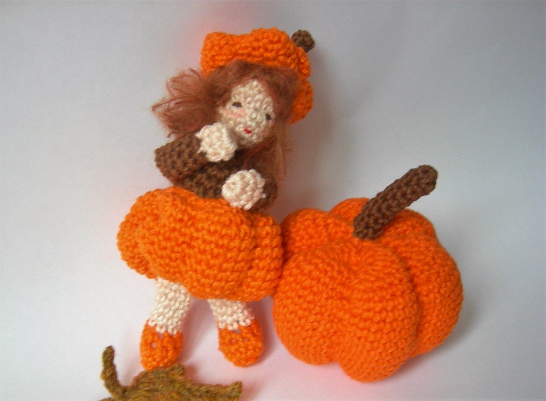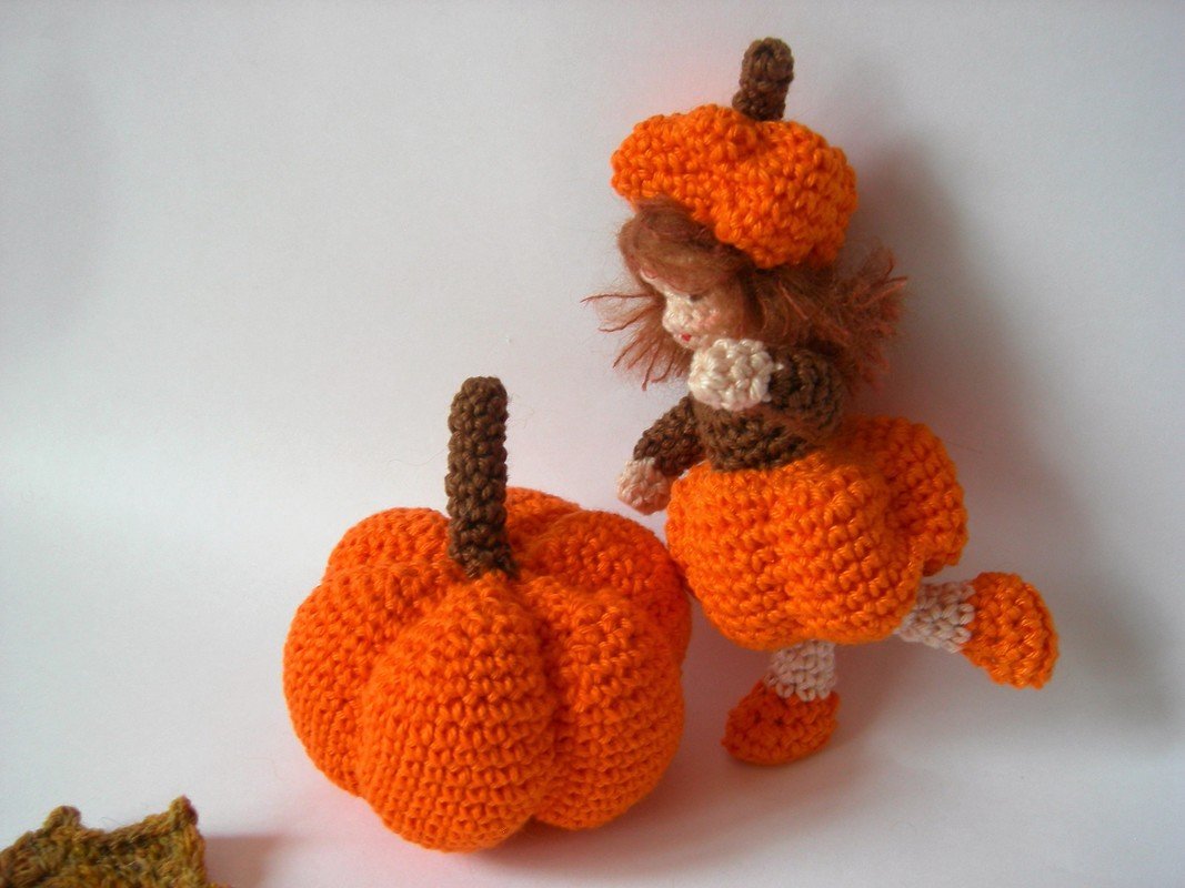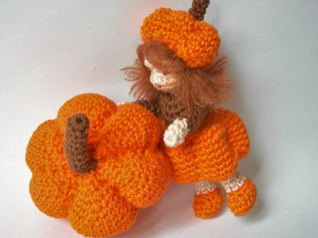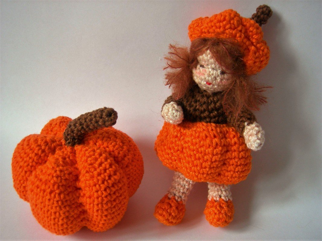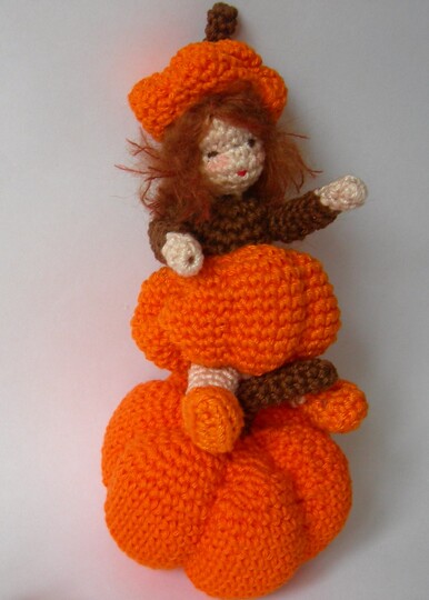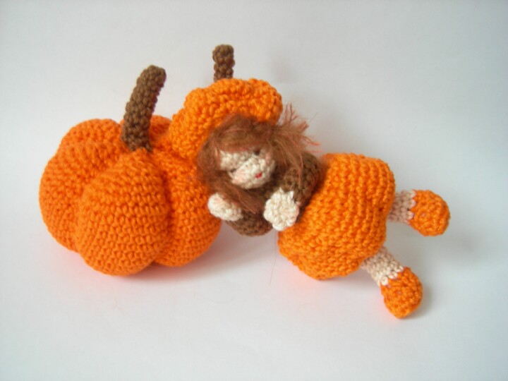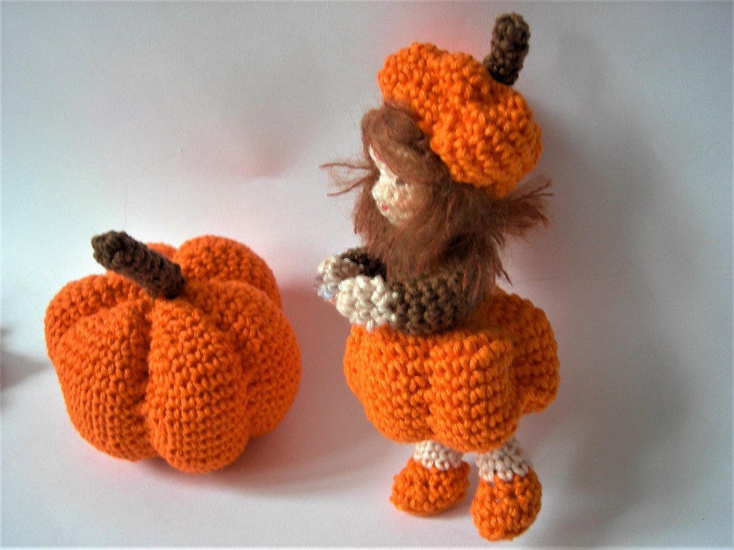 Das Kürbiskind wird etwa 12 cm groß und hat bewegliche Arme und Beine, so dass du es in verschiedenene Positionen dekorieren kannst. Der Kürbis kann in jeder beliebigen Größe gehäkelt werden (wird in der Anleitung ausführlich erklärt).
