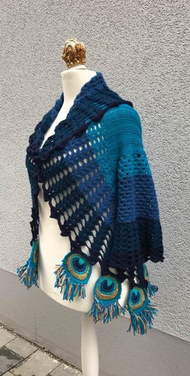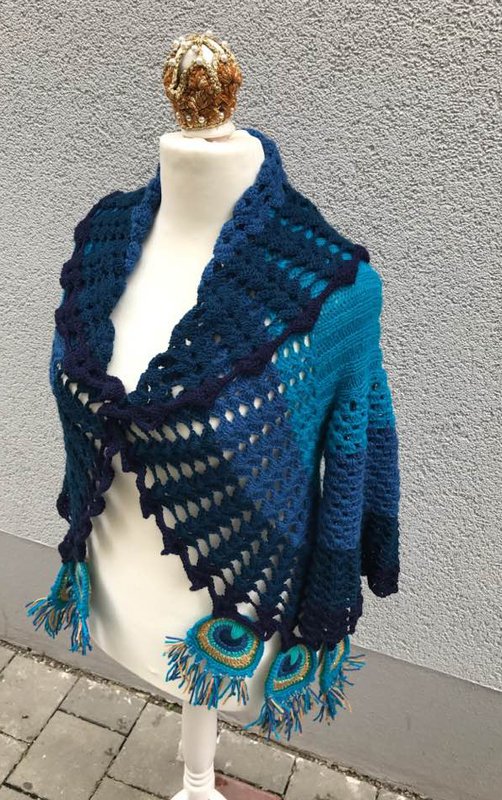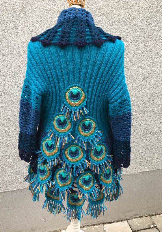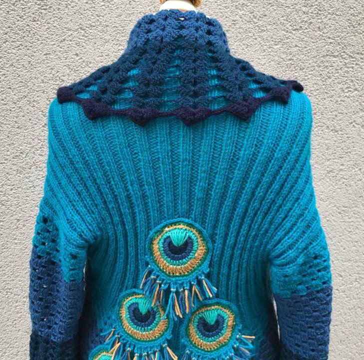 Die bezaubernde Pfauenjacke ist gehäkelt UND gestrickt ( Du musst also BEIDES können!) und eigentlich nach dem Prinzip „Kreisjacke“ gearbeitet,