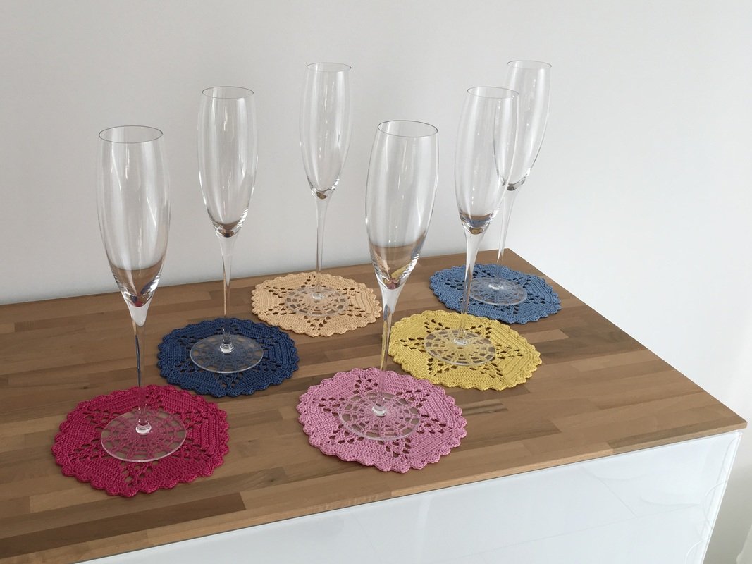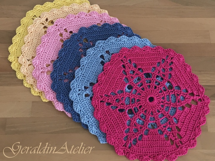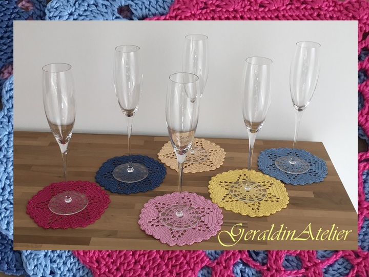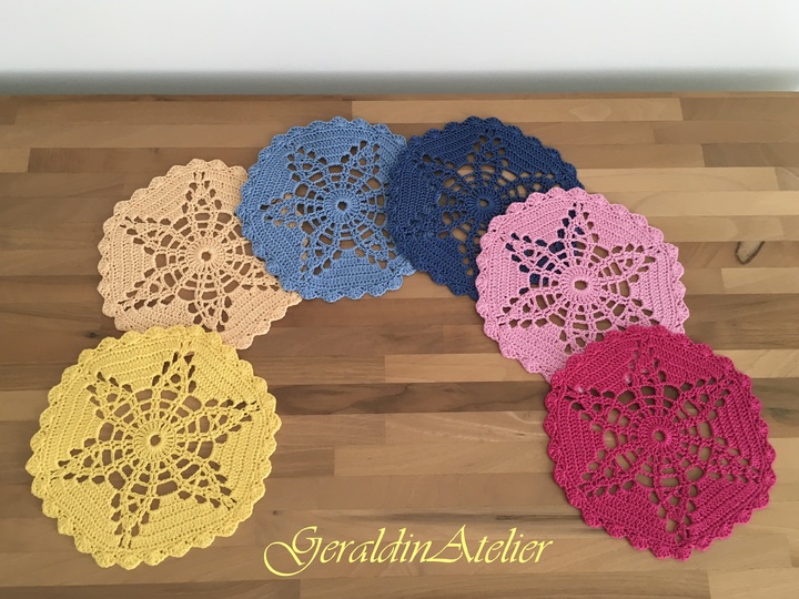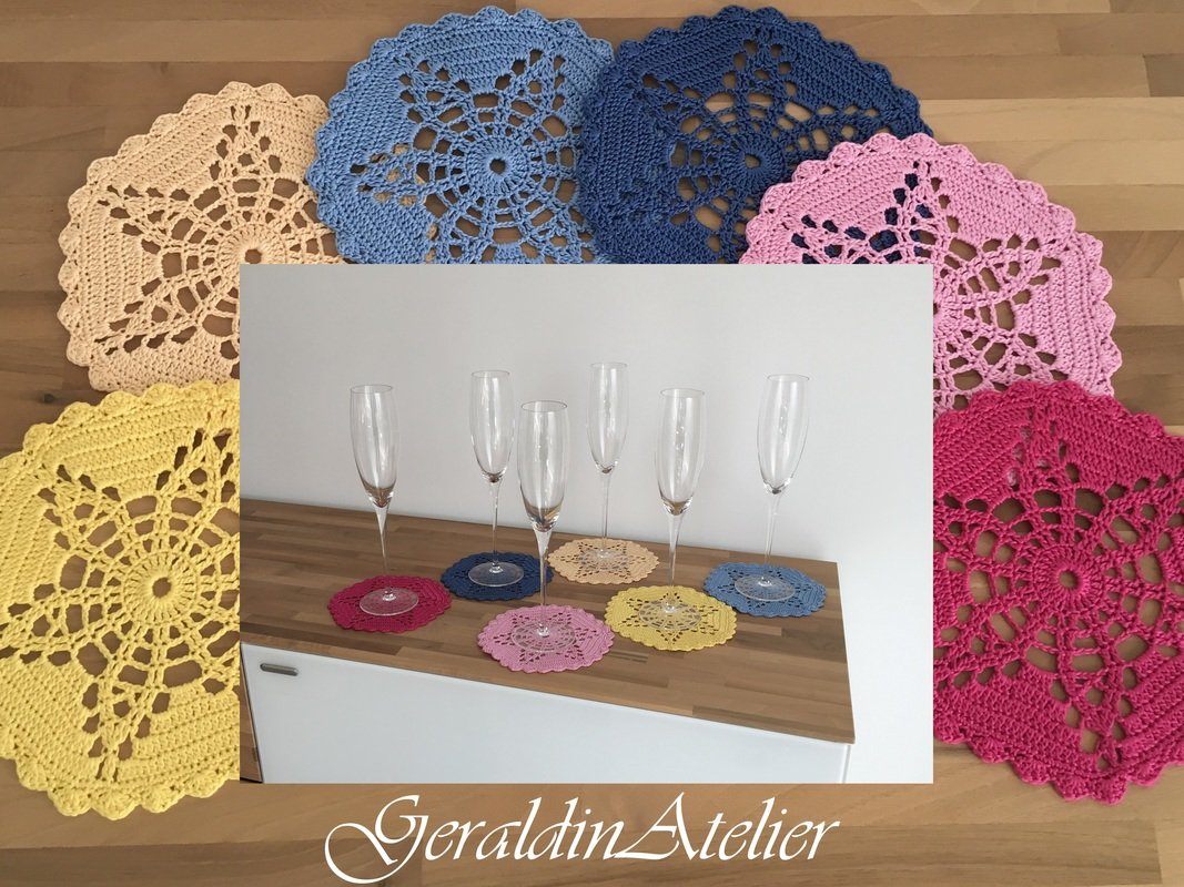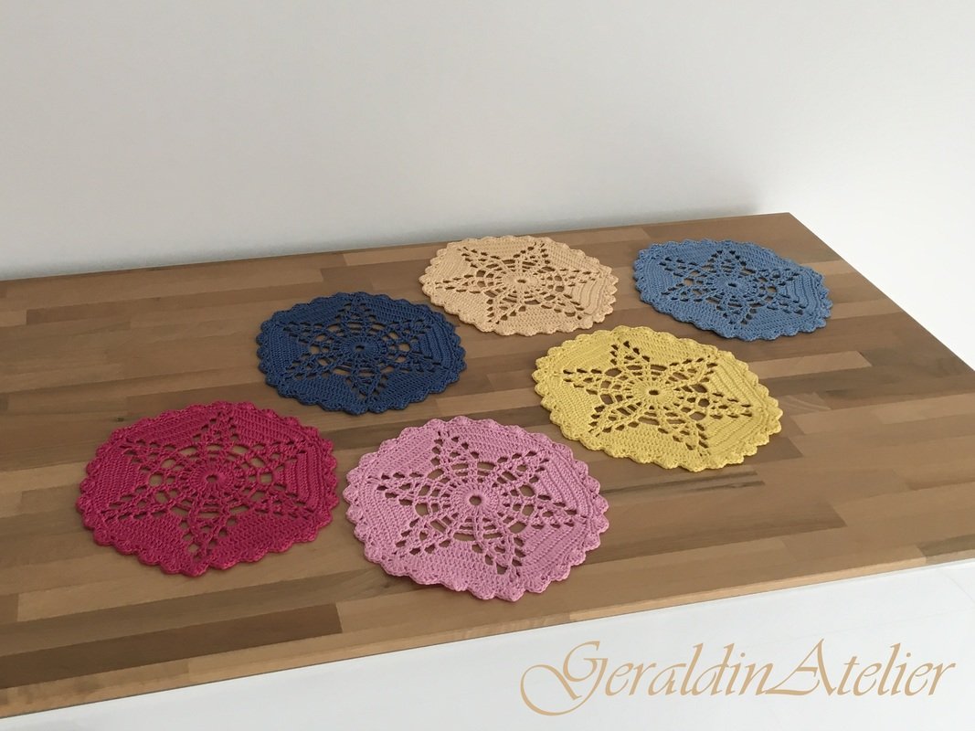 Für die 6 abgebildeten Untersetzer (Durchmesser ca. 15cm) wurde 60g Baumwolle insgesamt gebraucht.