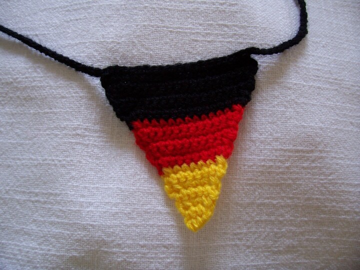 Mit dieser Anleitung können Deutschland-Fans ihre eigene Wimpelkette ganz leicht selber häkeln. Die Fähnchen werden etwa 9 cm breit und ebenso hoch. Die ganze Kette ist ca. 1,50 Meter lang. Es werden nur feste Maschen und Luftmaschen verwendet. Daher sollten auch Anfänger gut damit zurechtkommen. Gehäkelt wird mit einer Häkelnadel Stärke 4mm.