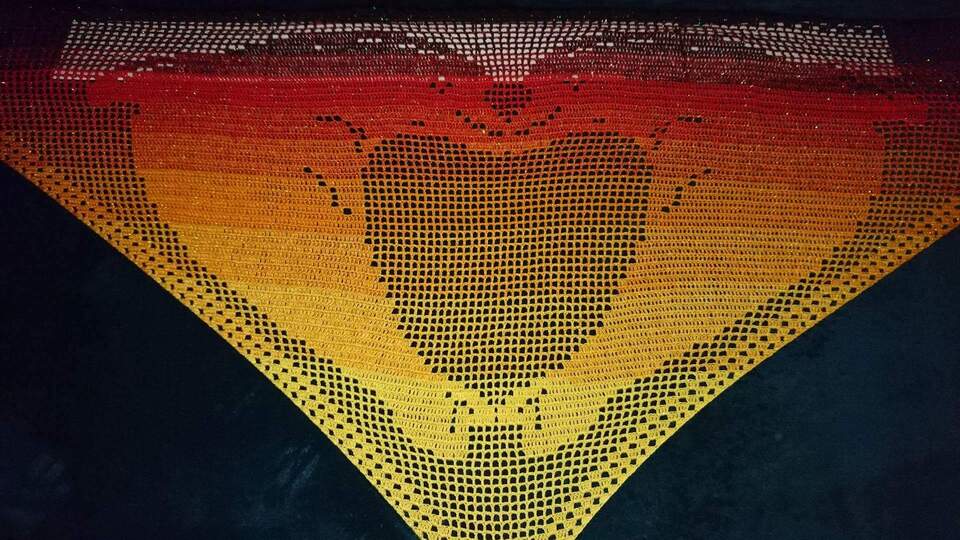 Das Motivtuch wurde mit einem 3 fädigen Farbverlaufsgarn gehäkelt. Verwendet wurden ca. 1200 Meter. Damit hat das Tuch eine Größe von etwa 210x90 cm.