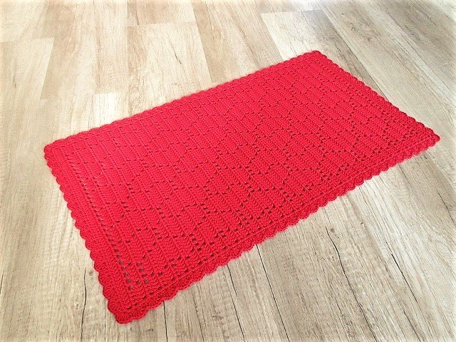 Verwendet wurden etwa 200 g (4 Knäuel) Myboshi No 2 in chillirot mit Häkelnadel Stärke 3,0. Der Läufer wird mit den angegebenen Materialien ca. 72 cm lang und 40 cm breit. Die Länge des Läufers läßt sich leicht anpassen. Mit sehr dickem Textilgarn gehäkelt auch als Teppich gut geeignet!