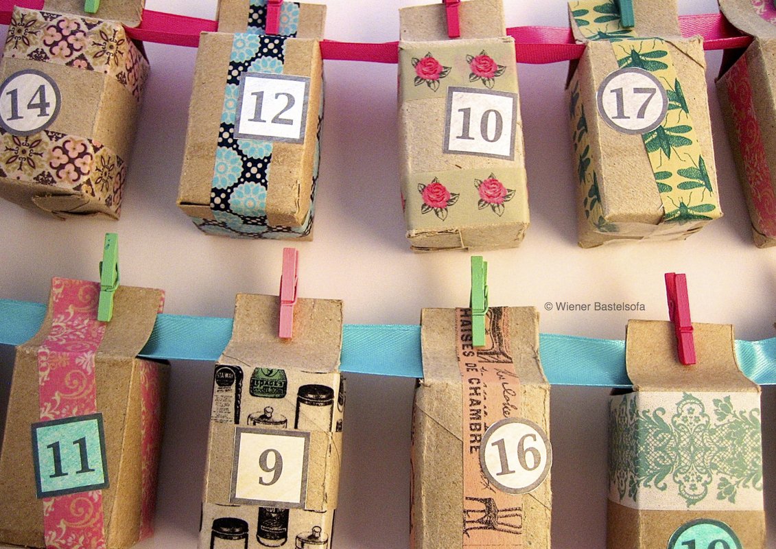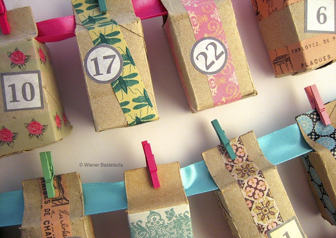 Diesen Adventskalender für kleine Überraschungen wie Konfekt, Radiergummis, kleine Seifen, Gutscheine,... kannst du aus WC-Papierrollen basteln. Die Boxen sind ohne Verschlusslasche 3,5 x 3,5 x 5 cm groß.