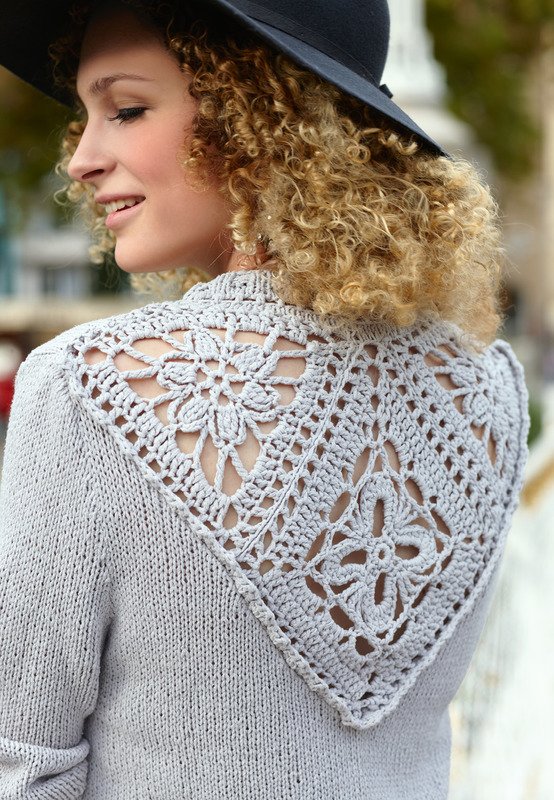 Lana Grossa "Il Puro" (100% Seide, LL ca 100 m/50 g): ca 400 (450-500) g Hellgrau Fb 6; addi-Stricknd 6 mm; addi-Rundstricknd 6 mm, 40 cm lang; addi-Häkelnd 4,5 mm.