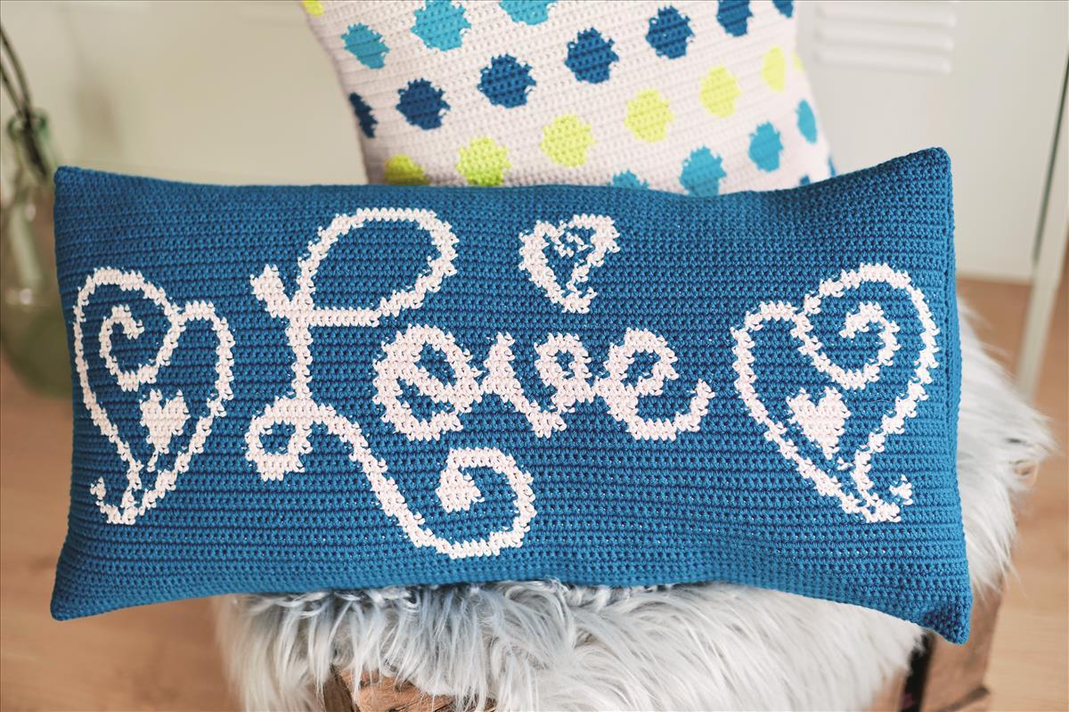 Kissen machen jedes Sofa noch gemütlicher. Gehäkelt wird das Kissen mit festen Maschen in der Tapestry-Technik. Schriftzug und Herzmotive in Weiß stehen in perfektem Kontrast zu dem frischen Blau.