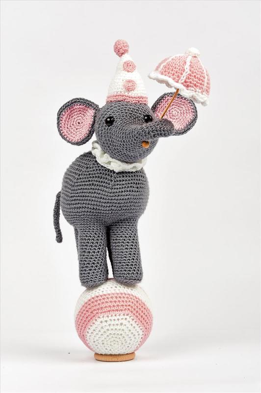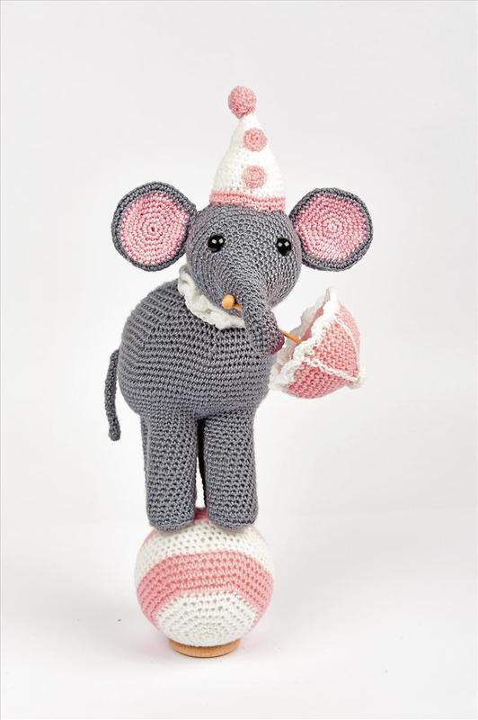 Die hübsche Elefantendame mit Zirkushut und Schirmchen balanciert gekonnt auf einem Ball. Etwas aufwändiger zu häkeln, doch das Ergebnis belohnt die Mühe!