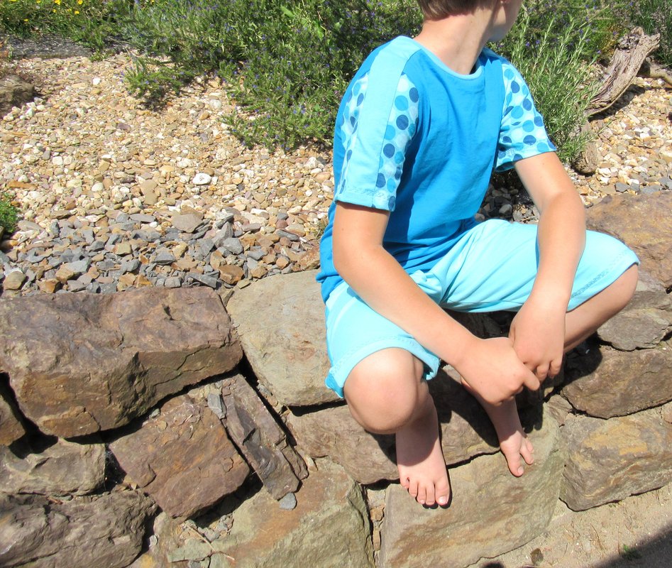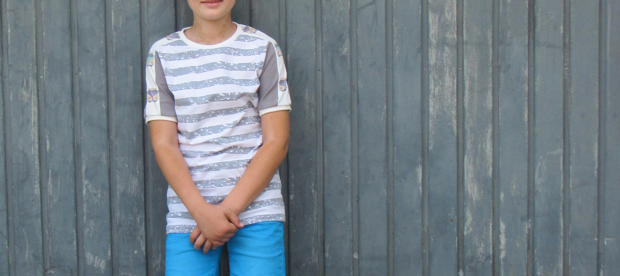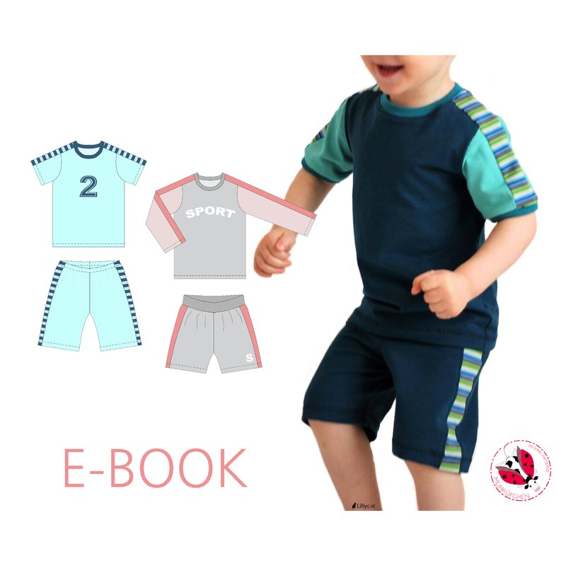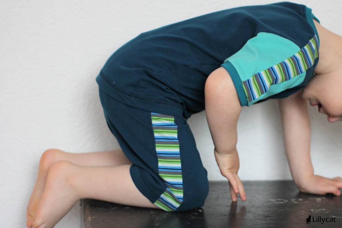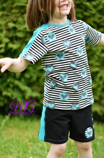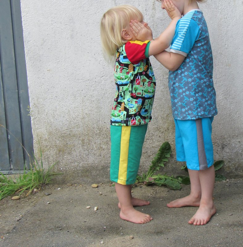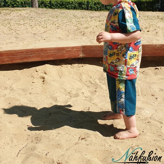 Für das Shirt eignet sich als Material Jersey, die Hose kann auch aus Sweat genäht werden, so sieht sie mehr nach Sporthose aus.