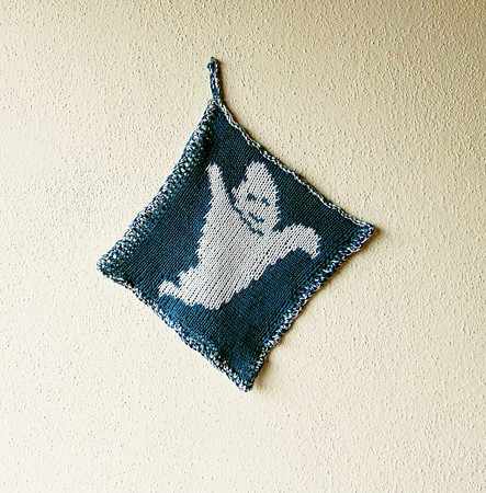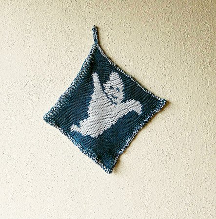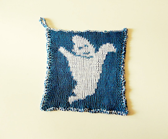 Wie auch immer, hier ist ein doppelt gestrickter Topflappen mit der Abbildung eines Gespensts. Es ist einfach nur gestrickt. Es ist nicht echt.
