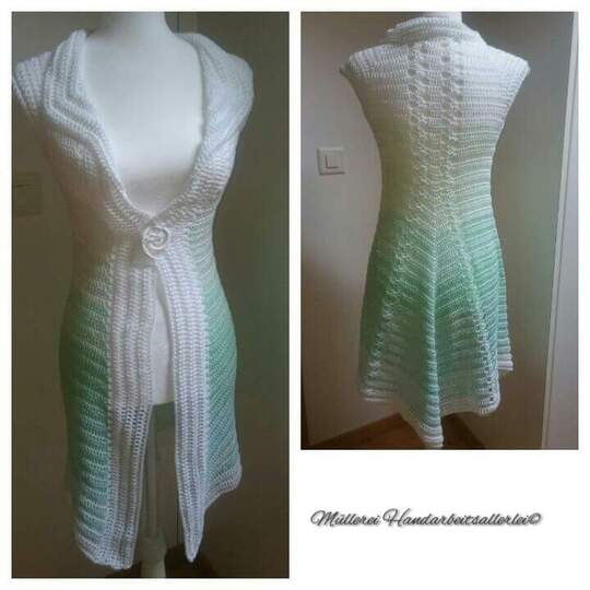 Die Jacke wird von oben nach unten gehäkelt. Die Blende und die Ärmel werden separat angehäkelt. Die Grösse kann individuell angepasst werden und kürzer oder länger gearbeitet werden. Die Anleitung enthält eine schriftliche Anleitung, Fotos und Häkelschriften.