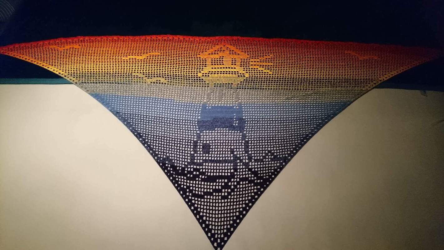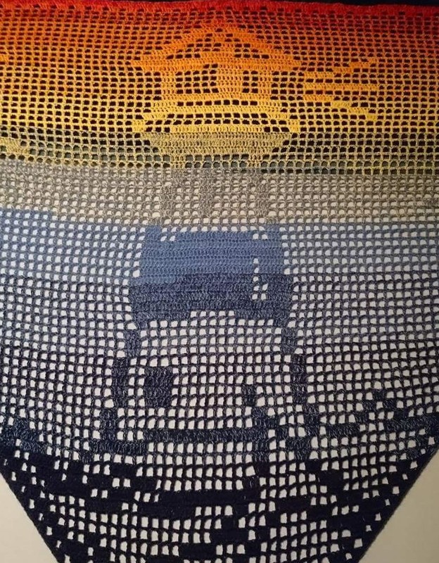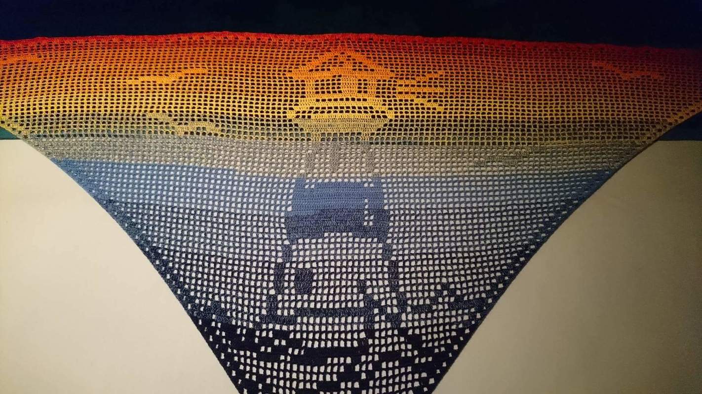 Das Motivtuch wurde mit einem 3 fädigen Farbverlaufsgarn gehäkelt. Verwendet wurden ca. 850 Meter. Damit hat das Tuch eine Größe von etwa 200x90 cm.