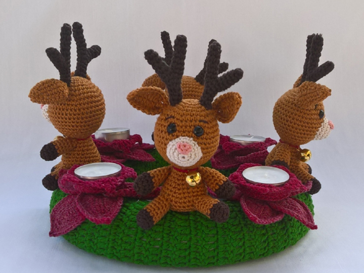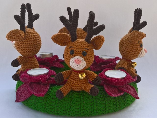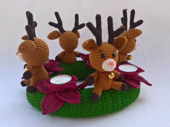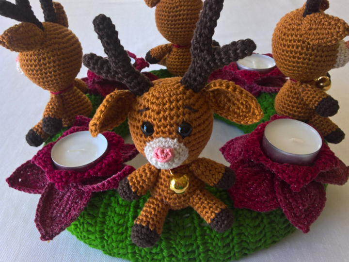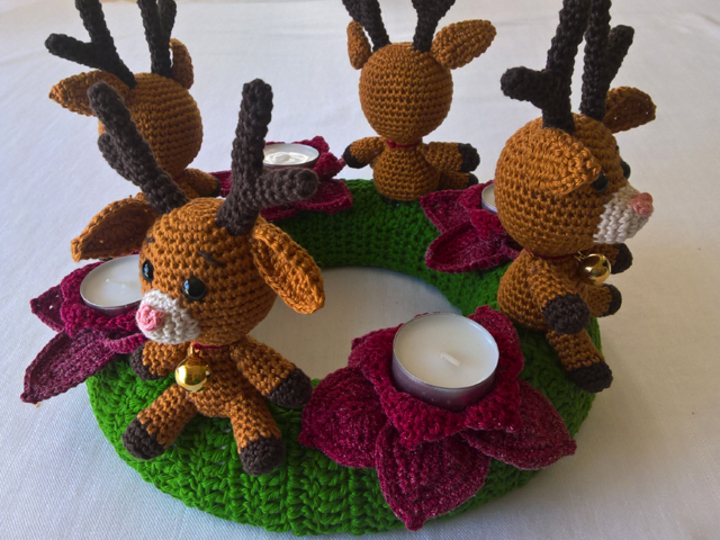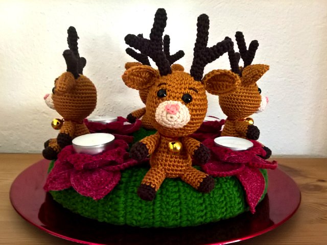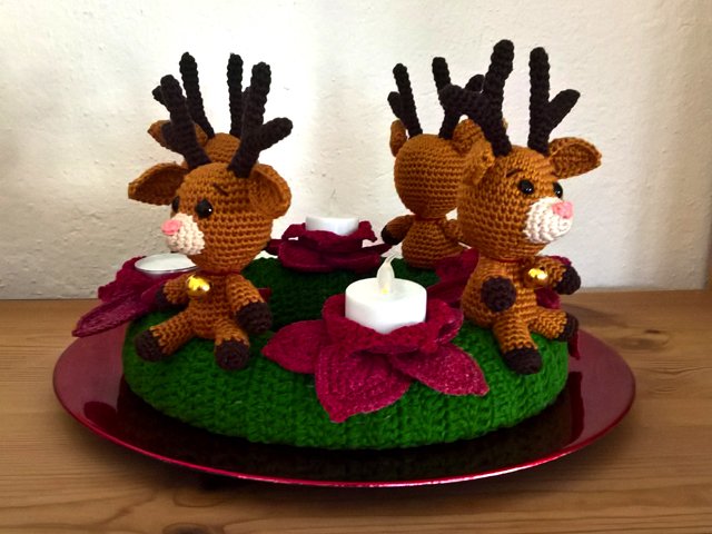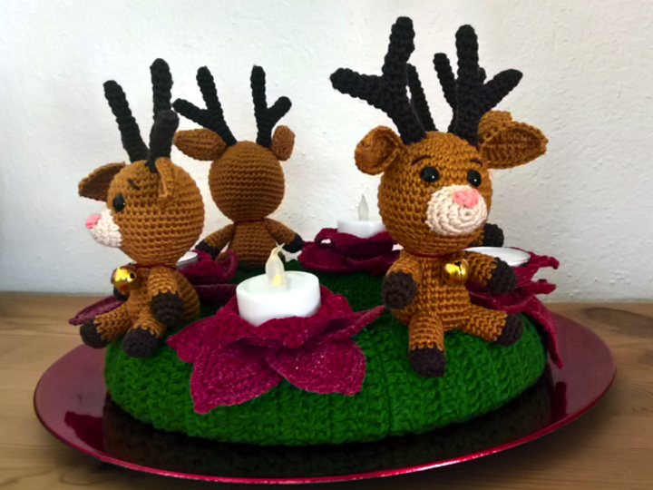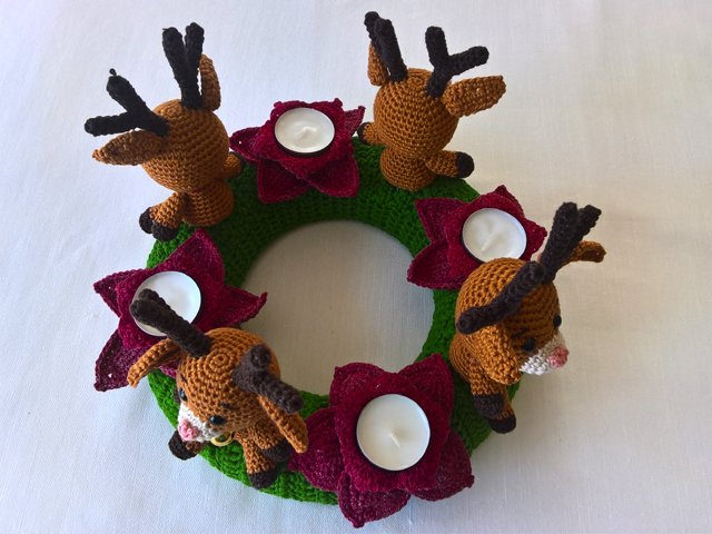 Der Kranz hat einen Durchmesser von 25 cm und die Elche sind schnuckelige 14 cm hoch. Die Anleitung ist gut bebildert und beschreibt ausführlich die Entstehung des Kranzes.