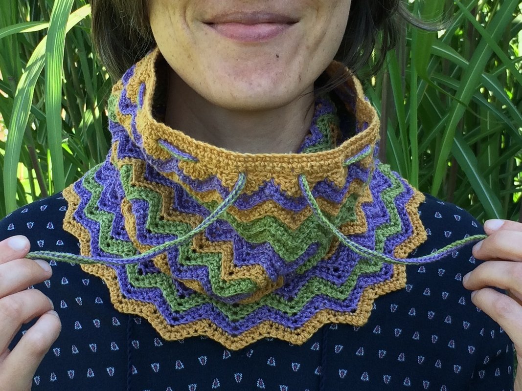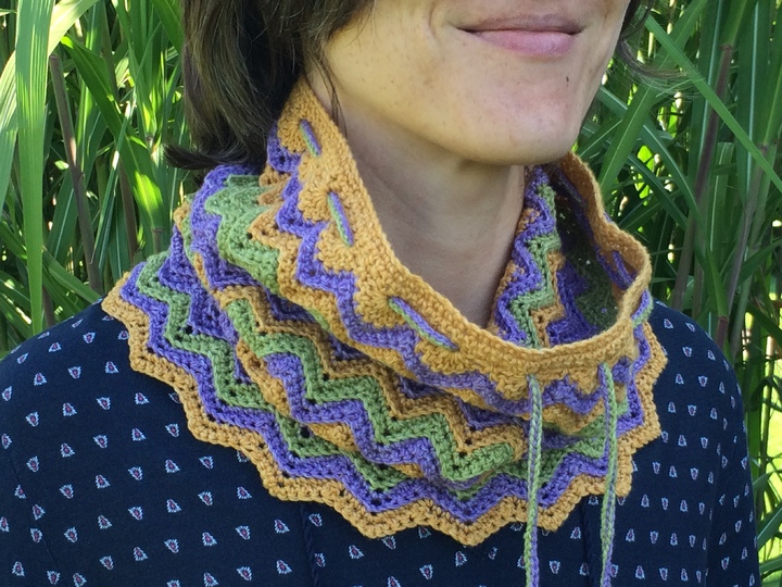 Der Loop ist in drei harmonisch aufeinander abgestimmten Farben in einem Zackenmuster gearbeitet und kann durch das eingezogene Häkelband in der Weite variabel getragen werden.