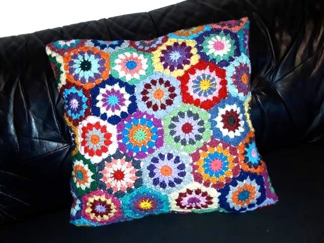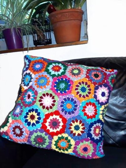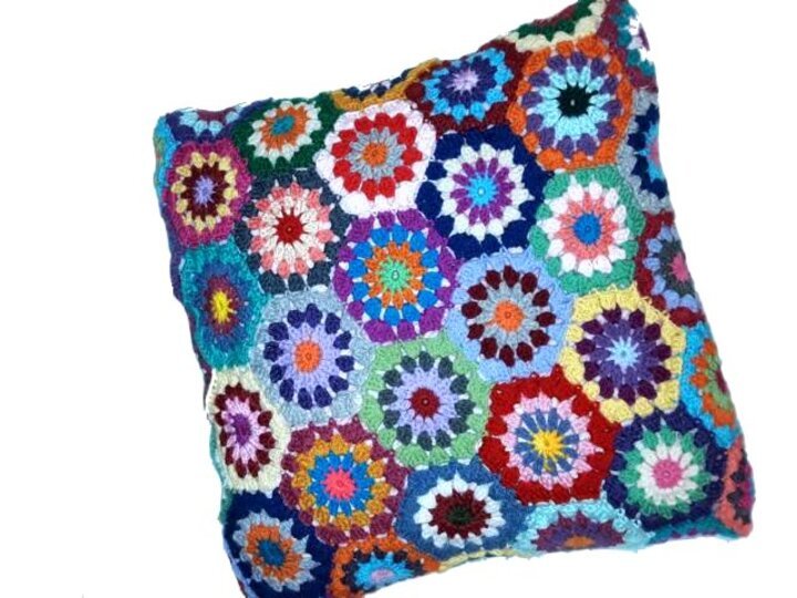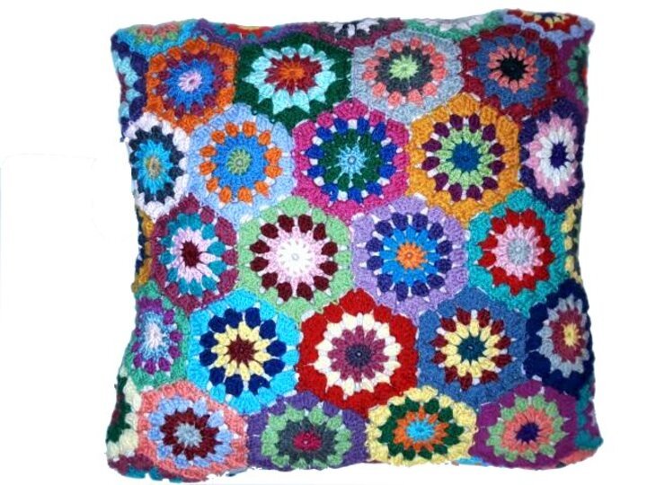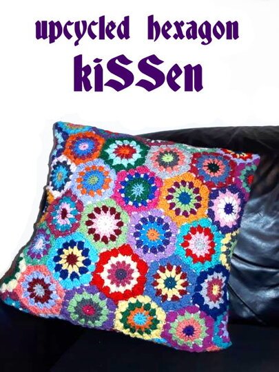 Mit dieser Häkelanleitung kannst du dir deine ganz individuelle Kissenhülle Upcicled Hexagon häkeln. Die Anleitung ist für ein große Kissen 50x50cm und ein etwas kleiner Kissen 40x40cm geschrieben.