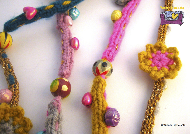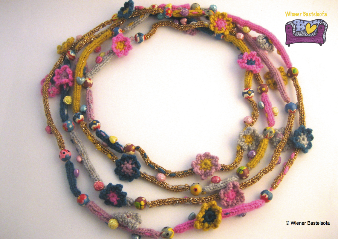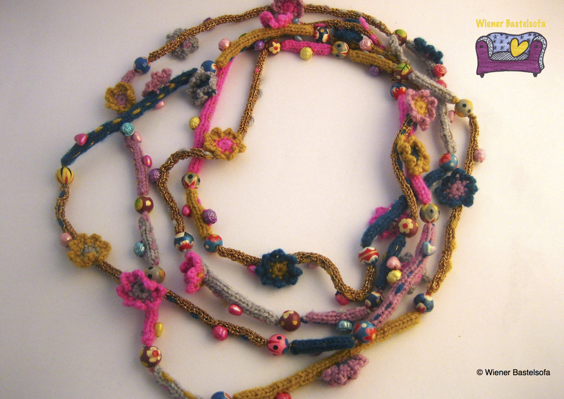 Die Kette ist sehr lang (ca. 3 m), du kannst sie entweder kürzer als Kinderkette arbeiten oder selbst 3- oder 4-reihig tragen. Wenn du willst, dass sie eine bestimmte Form behält, nähe sie an paar Stellen mit ein paar Stichen zusammen.