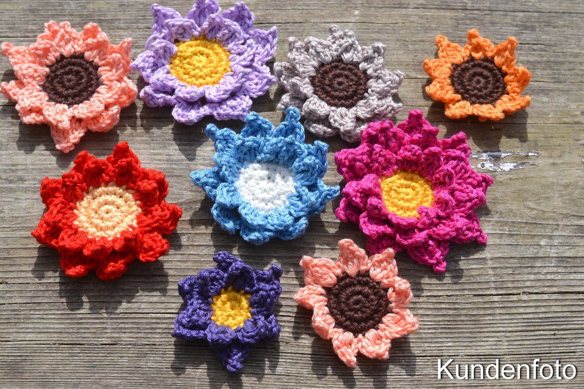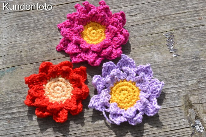 Dafür brauchst du nicht einmal viel Material, sondern kannst gut Restgarne verwerten. Auch in anderen Farben oder mit 2 oder 3 unterschiedlichen Farben sieht diese Blume toll aus und ist ein absoluter Hingucker, so kannst du sowohl Sonnenblumen als auch Sommerblumen häkeln. Ein paar Kundenfotos von anderen Farbvarianten findest du in der Galerie.