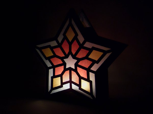 Achtung! Weil diese Laterne keinen flachen Boden hat, sollst du eine Beleuchtung wählen, die sich auch an der Faltkante befestigen lässt und sicherheitshalber keine richtige Kerze, sondern LED-Kerze verwenden. Ein Laternenstab mit batteriebetriebener Beleuchtung wäre auch eine Möglichkeit.