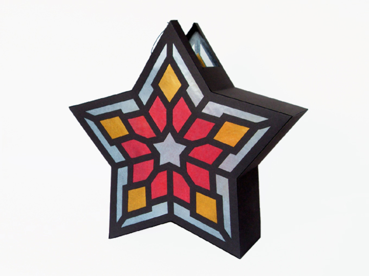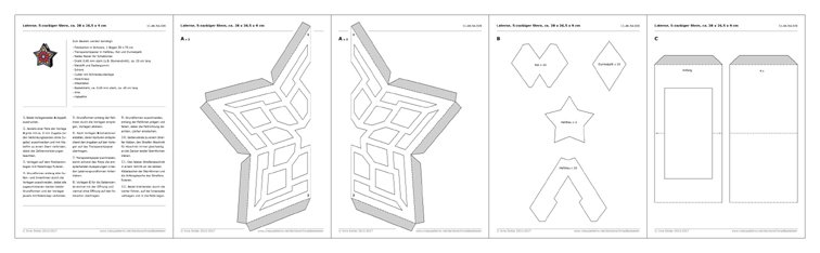 Der Download enthält eine PDF-Datei mit einer Seite Bastelanleitung sowie vier Seiten Vorlagenzeichnungen in Originalgröße. Vorlagenteile für die Sternformen müssen vor dem Übertragen auf den Fotokarton mit Klebefilm verbunden werden, Zahlenmarkierungen helfen dabei.