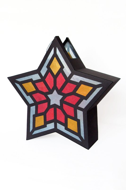 Achtung! Weil diese Laterne keinen flachen Boden hat, sollst du eine Beleuchtung wählen, die sich auch an der Faltkante befestigen lässt und sicherheitshalber keine richtige Kerze, sondern LED-Kerze verwenden. Ein Laternenstab mit batteriebetriebener Beleuchtung wäre auch eine Möglichkeit.