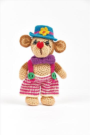 Ca. 50 g Fein, Fb beige (Junghans, 100 % Polyacryl, LL= ca. 750 m/150 g); ca. 50 g Perle Garn, Fb hellbraun (Woll Butt, 100 % Polyacryl, LL= ca. 880 m /200g); ca. 20 g “Versailles Supersoft“, Fb vanille (Woll Butt, 100 % Polyacryl, LL= ca. 196 m/50g); ca. 20 g Söckli Uni, Fb pink (Woll Butt, 75 % Schurwolle, 25 % Polyamid, LL= ca.210m / 50g); Rest Baumwollgarn Fb türkis, pink, goldgelb, violett, rot und grün; Sticktwist, schwarz und weiß; Blei-Band; Füllwatte (alles buttinette); Häkelnadel Nr. 2,5 - 3; Wollnadel; Alleskleber; drei Styropor-Eier, 6cm; Kunststoffaugen, schwarz, Ø 10 mm; Holz-Spieße, 10 cm, ø 3 mm (alles Rayher); Feste Pappe; Klett-Punkt, weiß; 3 kleine Druck-Knöpfe; schmales Gummiband ca. 50 g Kuschelgarn Maya Fb kamel (Woll Butt, 63 % Polyamid, 37 % Schurwolle , LL =ca. 130 Meter/50 g); ca. 20 g “Versailles Supersoft“, Fb beige, Rest weiß (Woll Butt, 100 % Polyacryl, LL = ca. 196 m /50g); Rest Söckli Uni, Fb pink, grün, violett, blau und gelb (Woll Butt,75 % Schurwolle, 25 % Polyamid, LL =ca.210m / 50g); ca. 30 g Poco Fb hellblau (Junghans, 100 % Polyacryl, LL= ca. 140 m/ 50 g); Rest Fein, Fb blau (Junghans 100 % Polyacryl, LL= ca. 750 m /150 g); Rest Lurex Fb blau; Sticktwist, schwarz; Blei-Band; Füllwatte (alles buttinette); Häkelnadel Nr. 2,5 - 3; Wollnadel; Alleskleber; Sicherheitsaugen, schwarz, Ø 12 mm ; Tier-Nase braun, Ø 15 mm; Blumendraht; Satinband, 6mm breit, weiß; Glitzer-Pompons, blau, pink und violett, Ø 1cm; Feste Pappe; schmales Gummiband ca. 50 g Kuschelgarn Maya Fb kamel (Woll Butt, 63 % Polyamid, 37 % Schurwolle, LL= ca. 130 Meter/50 g); ca. 20 g “Versailles Supersoft“, Fb beige, Rest weiß und grün (Woll Butt, 100 % Polyacryl, LL= ca. 196 m /50g); ca. 20 g Söckli Uni, Fb pink (Woll Butt, 75 % Schurwolle, 25 % Polyamid, LL =ca. 210m /50g); Rest Baumwollgarn Fb violett, gelb; Rest Lurex Fb grün; Sticktwist, schwarz; Blei-Band; Füllwatte (alles buttinette) ; Häkelnadel Nr. 2,5 - 3; Wollnadel; Alleskleber; Sicherheitsa