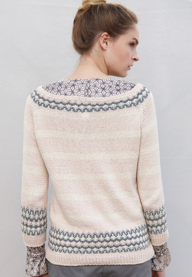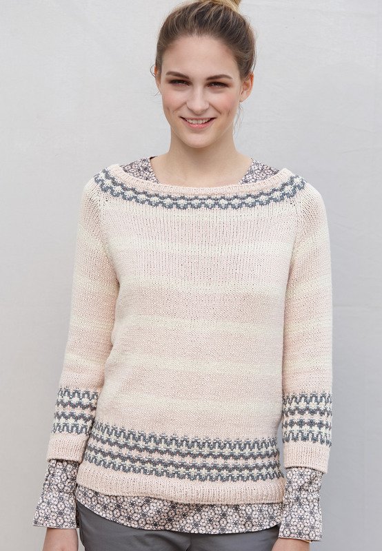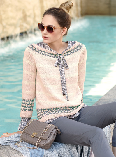 Lana Grossa "365 Cashmere" (77% Baumwolle, 15% Kaschmir, 8% Polyamid, LL ca 175 m/50 g): ca 200 (250-250-300) g Rosé Fb 17, ca 100 (150-150-200) g Natur Fb 11, ca 50 g Dunkelgrau Fb 04 und 50 g oder ein Rest Braun Fb 19; addi-Rundstricknd 4,5 mm, 80 cm lang, addi-Rundstricknd 4 mm, 60 cm lang.