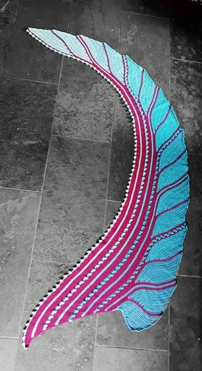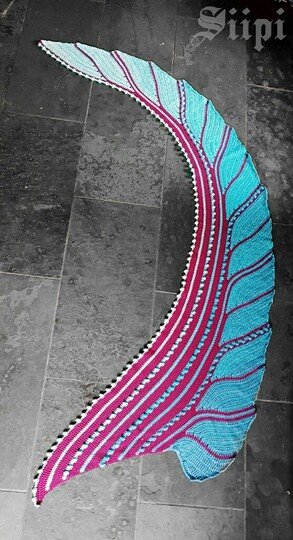 Der Schal erhält deine Form durch verkürzte Reihen. Durch die angewendete Kontrastfarbe, wirkt das Tuch wie ein Flügel.