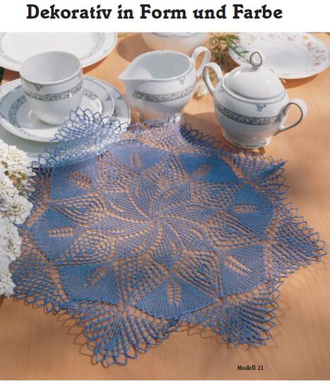 Die Anleitung umfasst eine Strickschrift und beinhaltet einen ausführlichen Lehrgang zum Kunststricken und zum Spannen von Deckchen