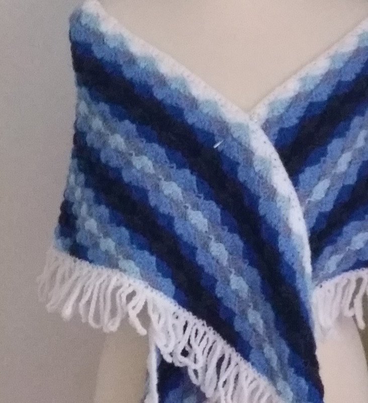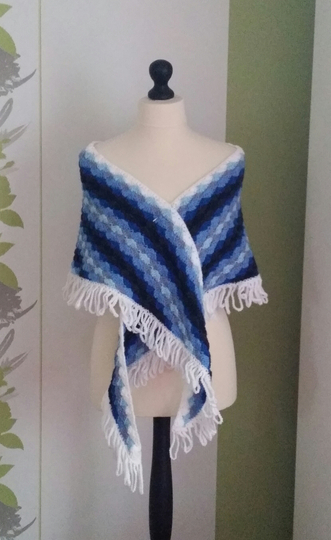 Die gehäkelte Stola in kühlen Eisfarben schmiegt sich warm um die Schultern. Man kann sich richtig hineinkuscheln, wenn es kalt draußen ist. Mit einer Schmucknadel als Verschluß hat man sogar die Hände frei.