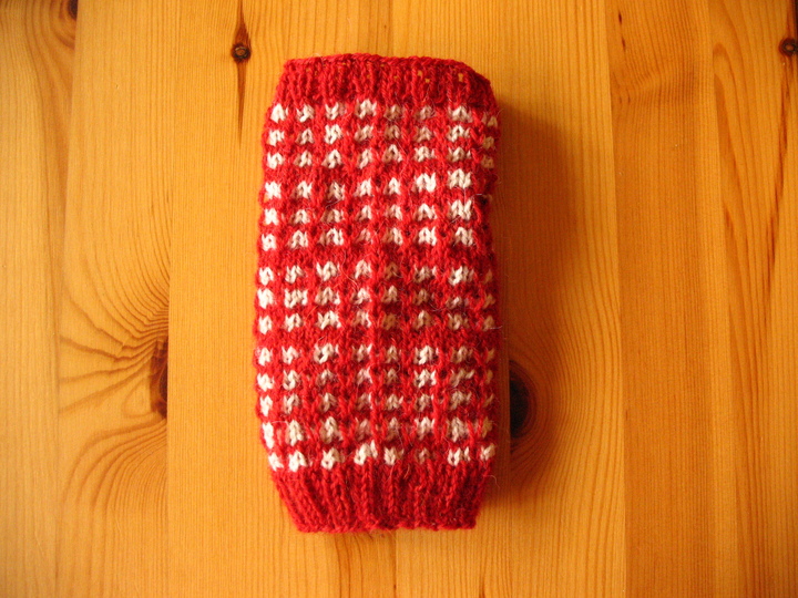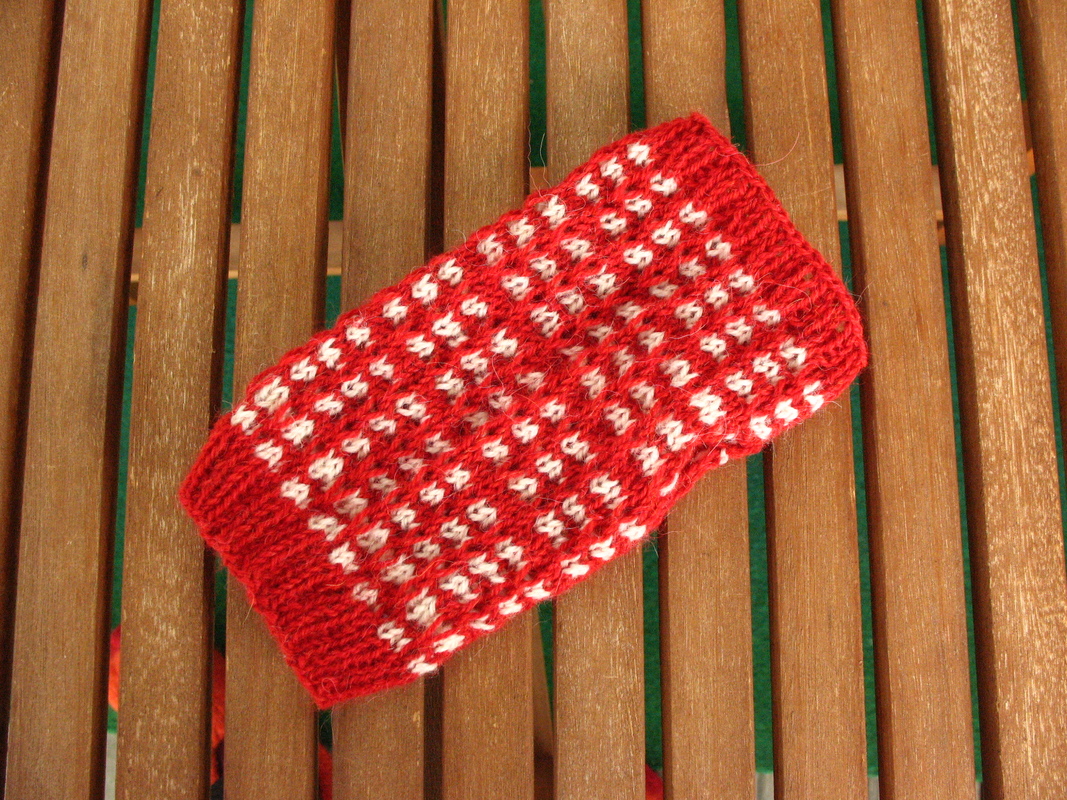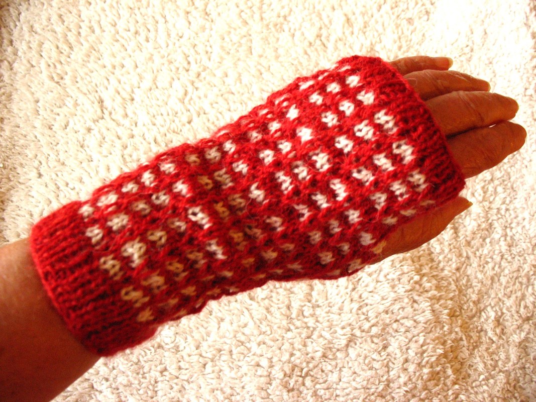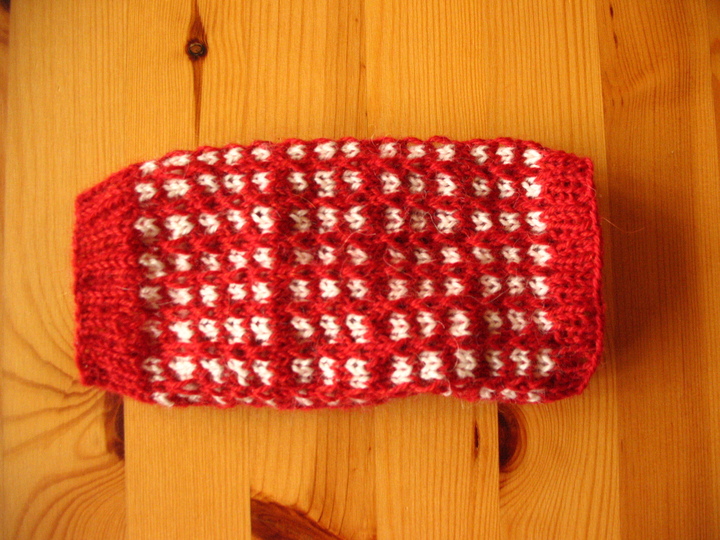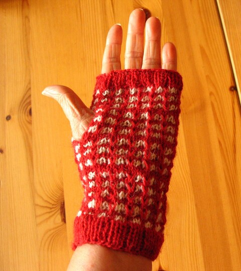 Diese Strickanleitung beschreibt Armstulpen bzw. Pulswärmer mit einem Muster in rot-weiß – passend für alle Größen.