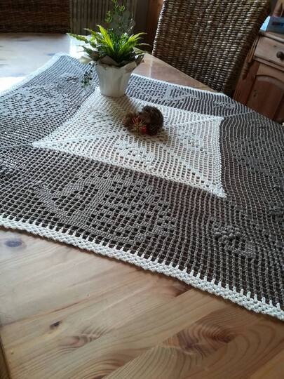 Die Mitteldecke Igel hat bei mir eine Größe von 95x95cm.Sie wird in der Mitte angefangen und in einem Stück gehäkelt.