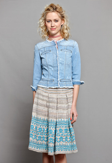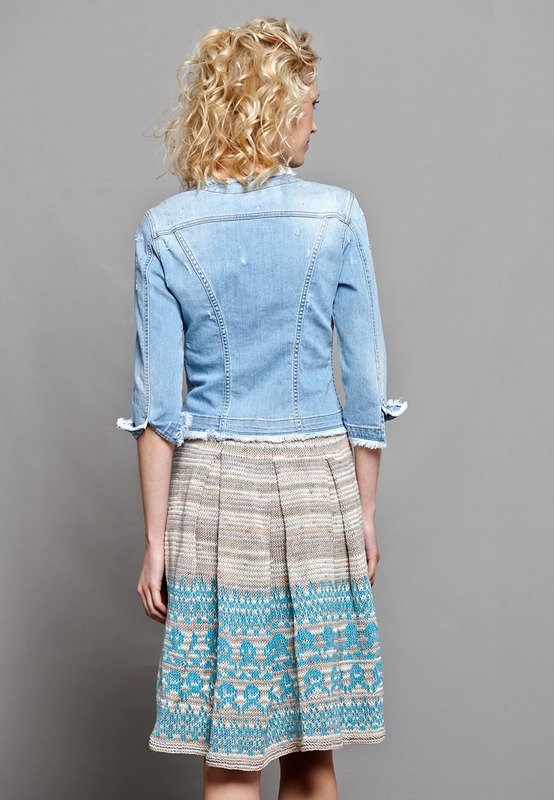 Frische Töne anschlagen! Dieser knielange Rock wird mit Kellerfalten und in einem Stück mit breiter Schmuckbordüre gestrickt. Damit gehen wir beschwingt durch den Sommer!