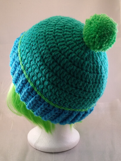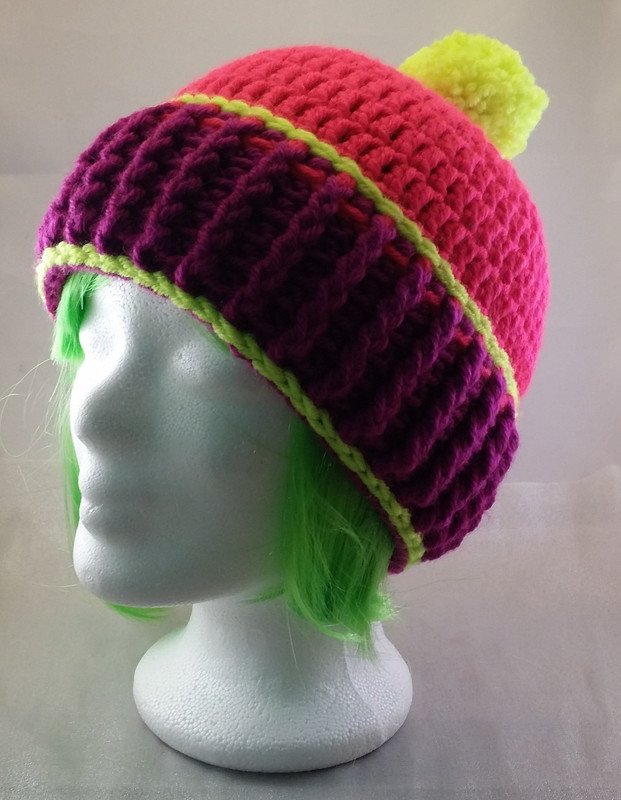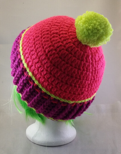 Pudelmützen gehen eigentlich immer! Die gehäkelte Mütze mit Kontraststreifen und farblich passendem Bommel ist aus extradickem Garn gehäkelt. So hält sie schön warm.